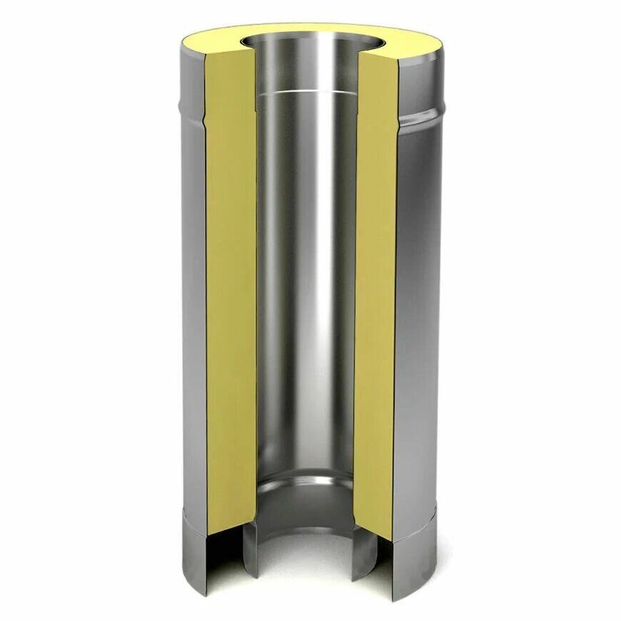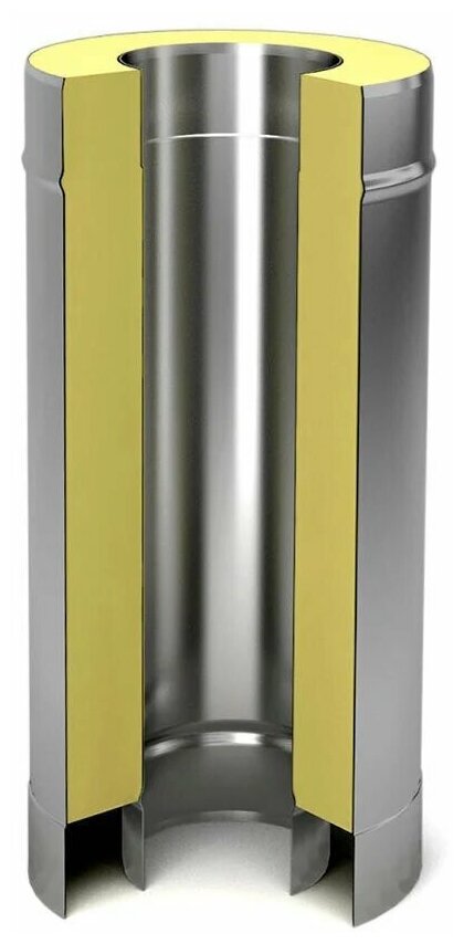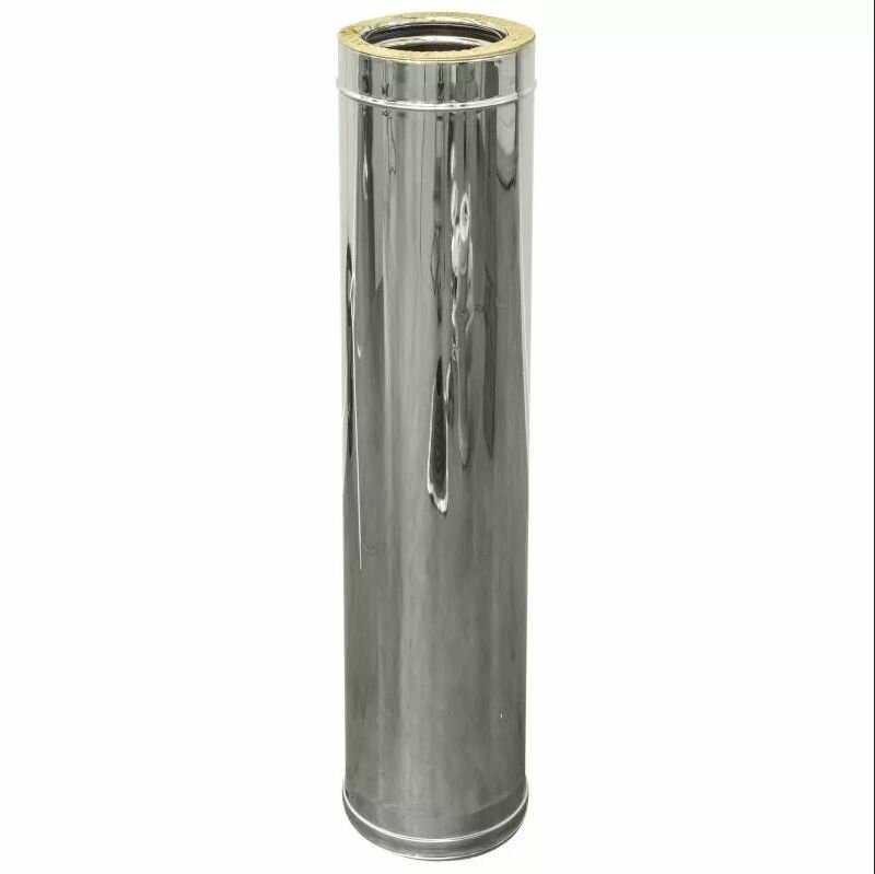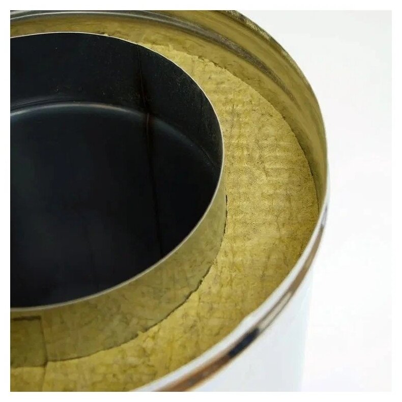 Сэндвич выполнен из металла толщиной 0,8 мм, поэтому подходит для установки на начальных участках дымохода, где температура отработанных газов выше. Диаметр трубы ― 210 мм. Внутренний диаметр ― 150 мм. Длина сэндвича составляет 1 м.