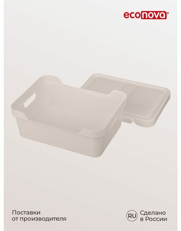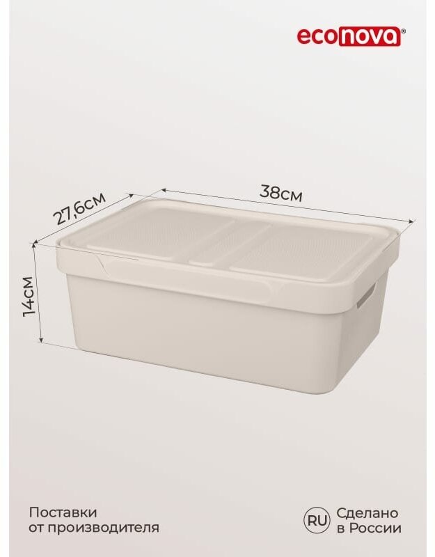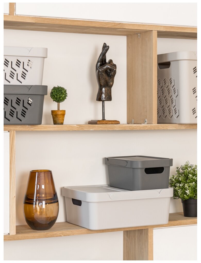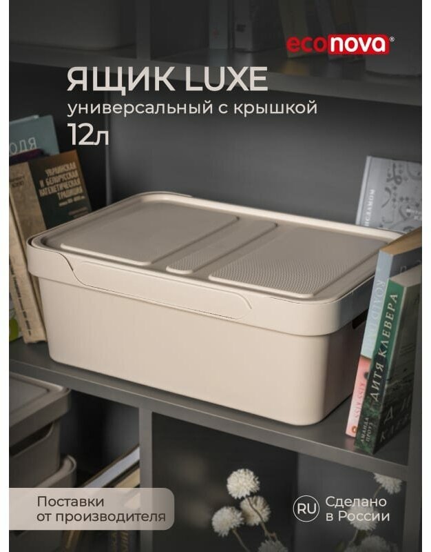 **Ящик с крышкой Luxe**, сочетающий в себе практичность и стильное оформление, станет модным украшением полки либо стеллажа. Модель выполнена из полипропилена, размер — 380 × 276 × 140 мм, полезный объем — 12 л. Ящик выполнен в сером цвете, по бокам сделаны сквозные ручки для переноски. Крышка в перевёрнутом виде превращается в удобную полку для мелочей. Изделие произведено в России. Гарантия — 1 год.