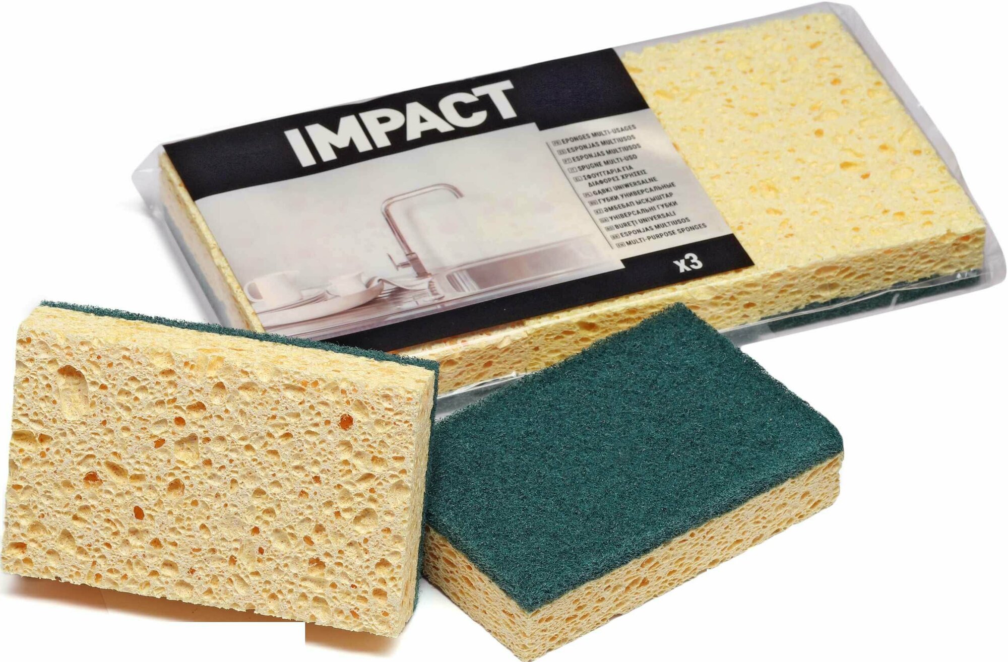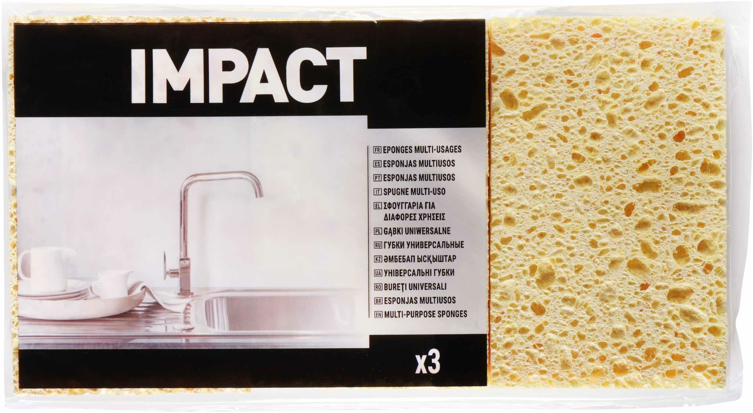 **Губки для уборки Impact** изготовлены из мягкой целлюлозы, обработанной особым способом. Материал приятный на ощупь, хорошо впитывает влагу, начисто удаляет все загрязнения, насухо вытирает влагу. Жесткая сторона хорошо чистит любые застарелые пятна, не оставляя царапин.