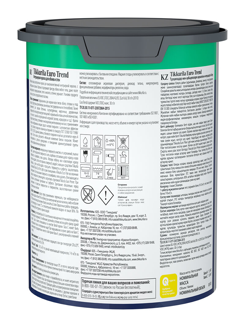 **Краска интерьерная моющаяся для обоев и стен Tikkurila Euro Trend** предназначена для окраски всех типов обоев, готовых и под окраску (структурных, флизелиновых, виниловых, текстурированных и стеклообоев). А также применяется для окраски бетонных, оштукатуренных, кирпичных, деревянных поверхностей и гипсокартона внутри помещений с нормальной и повышенной влажностью, в том числе с высокой эксплуатационной нагрузкой (холлов, ов и т.д.). Может использоваться в детских учреждениях и помещениях административной группы лечебно-профилактических учреждений.