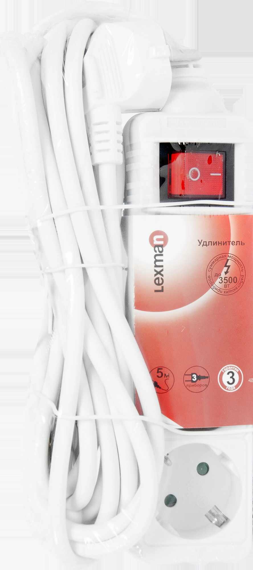 Удлинитель бытовой Lexman 3 розетки с заземлением 3х1.5 мм 5 м 3500 Вт цвет белый
