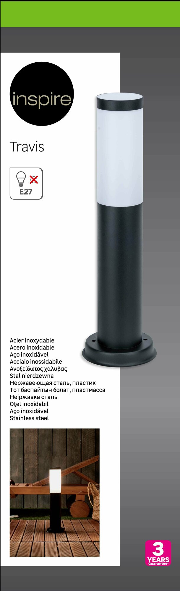 **Столб уличный Inspire Travis** дополнит садово-парковый ландшафт, оформление входной группы или зоны отдыха во дворе. Подойдет для подсветки пешеходных дорожек, газонов, цветников. Работает от сети с напряжением 220-240 В. Материал корпуса — окрашенная нержавеющая сталь, цвет — черный. Степень защиты: IP44 — защита от дождя. Прибор совместим с лампами с цоколем Е27, мощность которых не превышает 25 Вт. Размеры модели — 12,5 × 45 × 12,5 см.