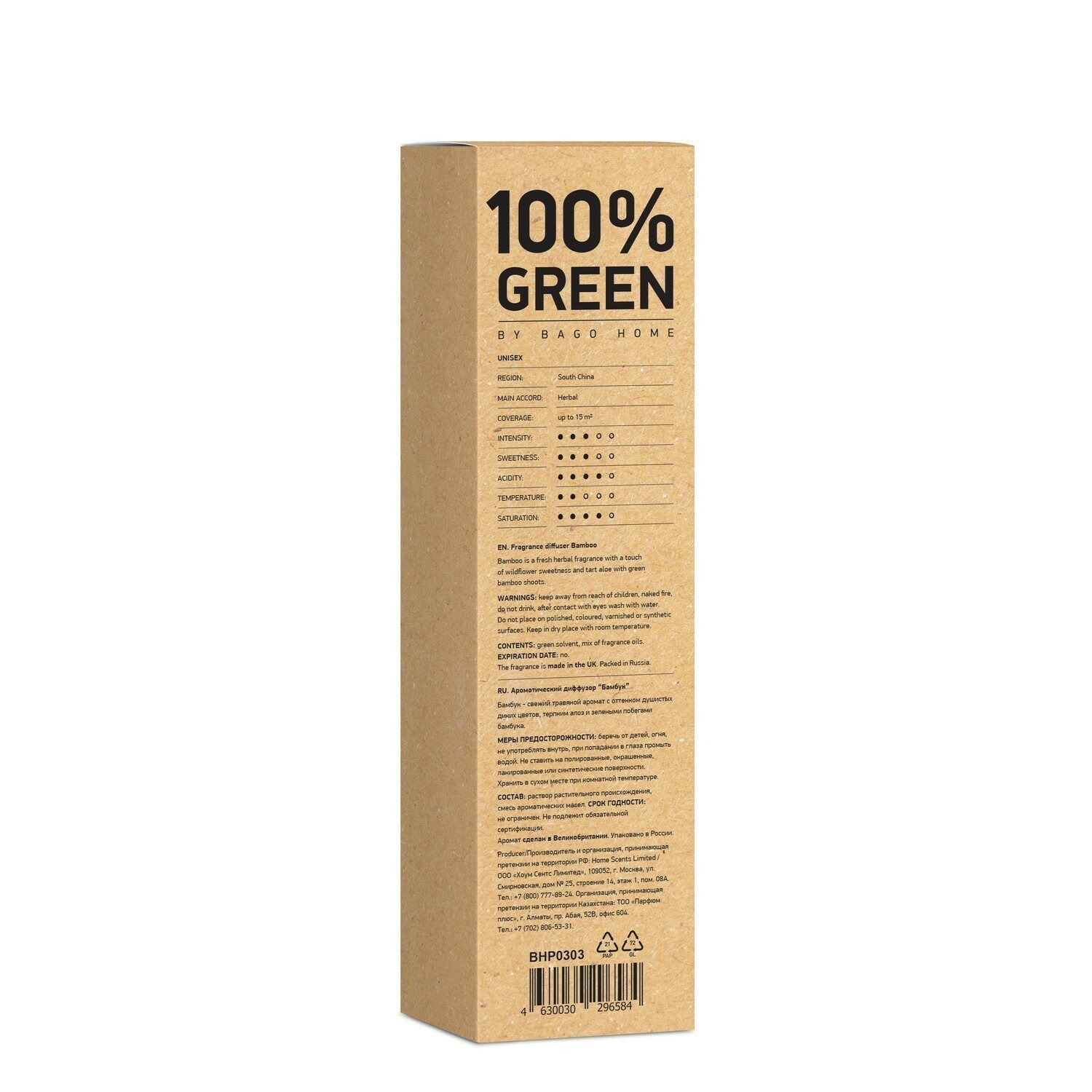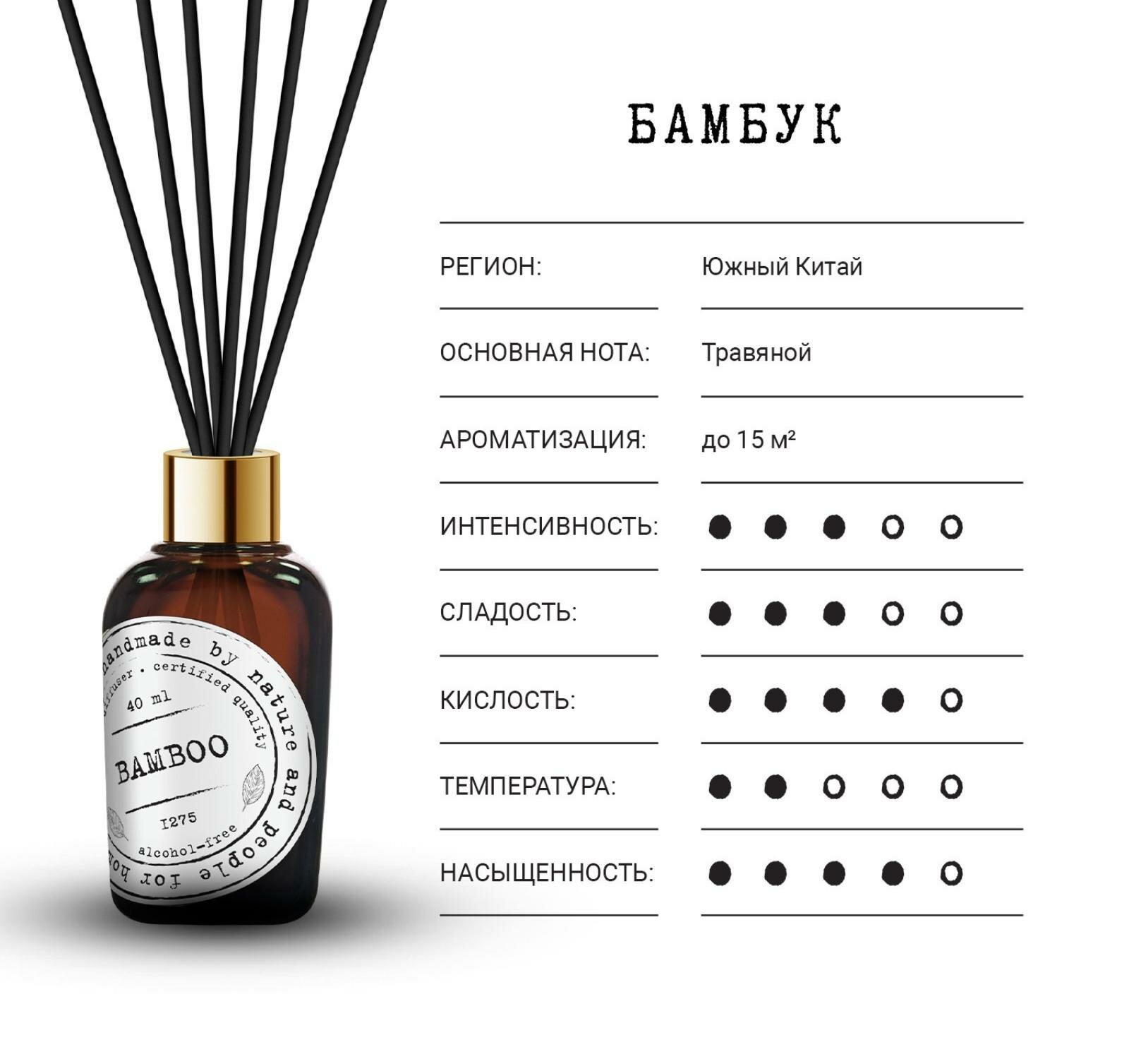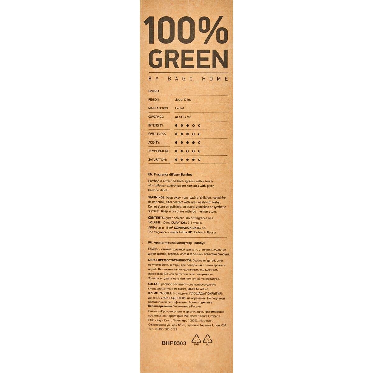 | Особенности | Ароматический диффузор "Бамбук" от BAGO home звучит музыкой зеленых флейт тонких стволов. Открываясь свежестью травянистых нот в верхнем ярусе, легкий аромат встречает водянистую прохладу алоэ в сердце пирамиды. Завершает композицию нежная зелень весенних побегов бамбука в нижних нотах. |