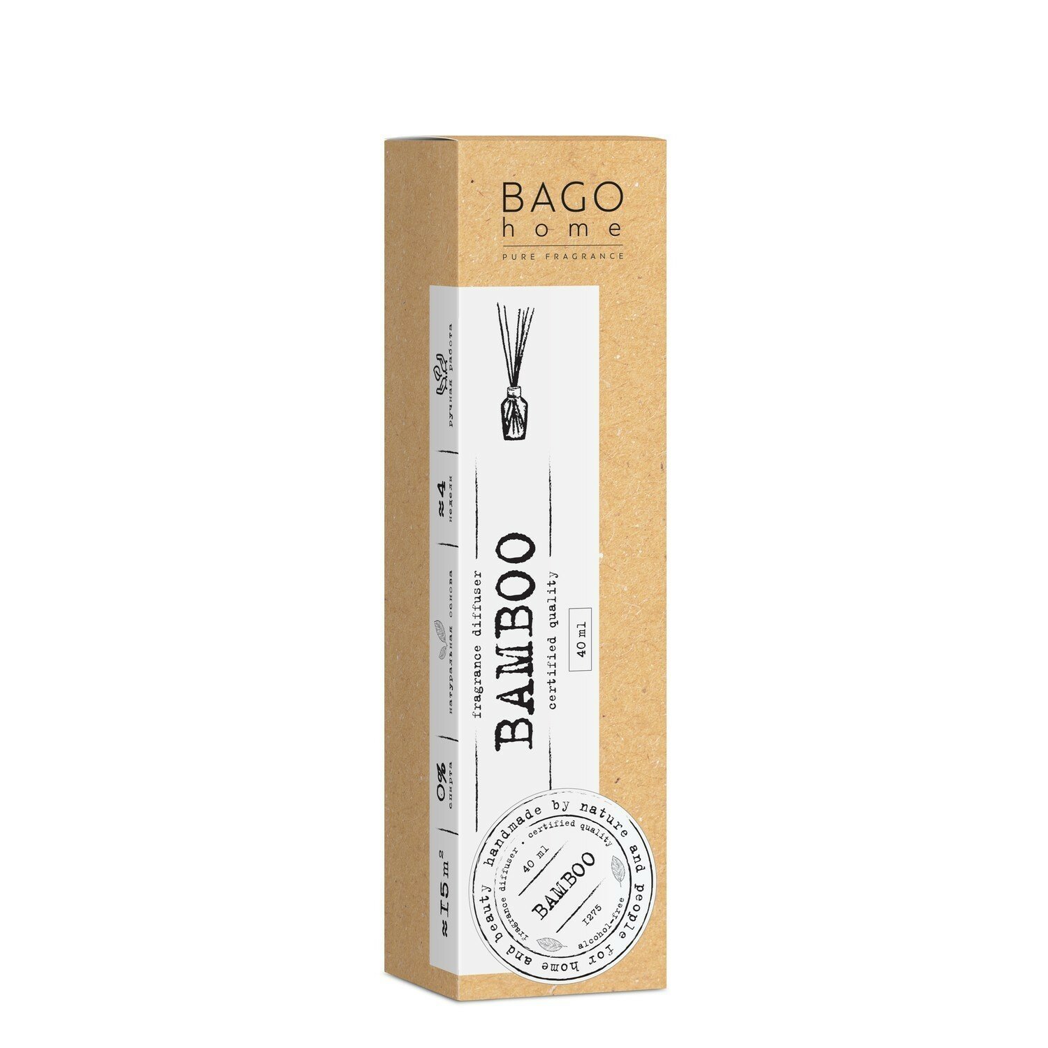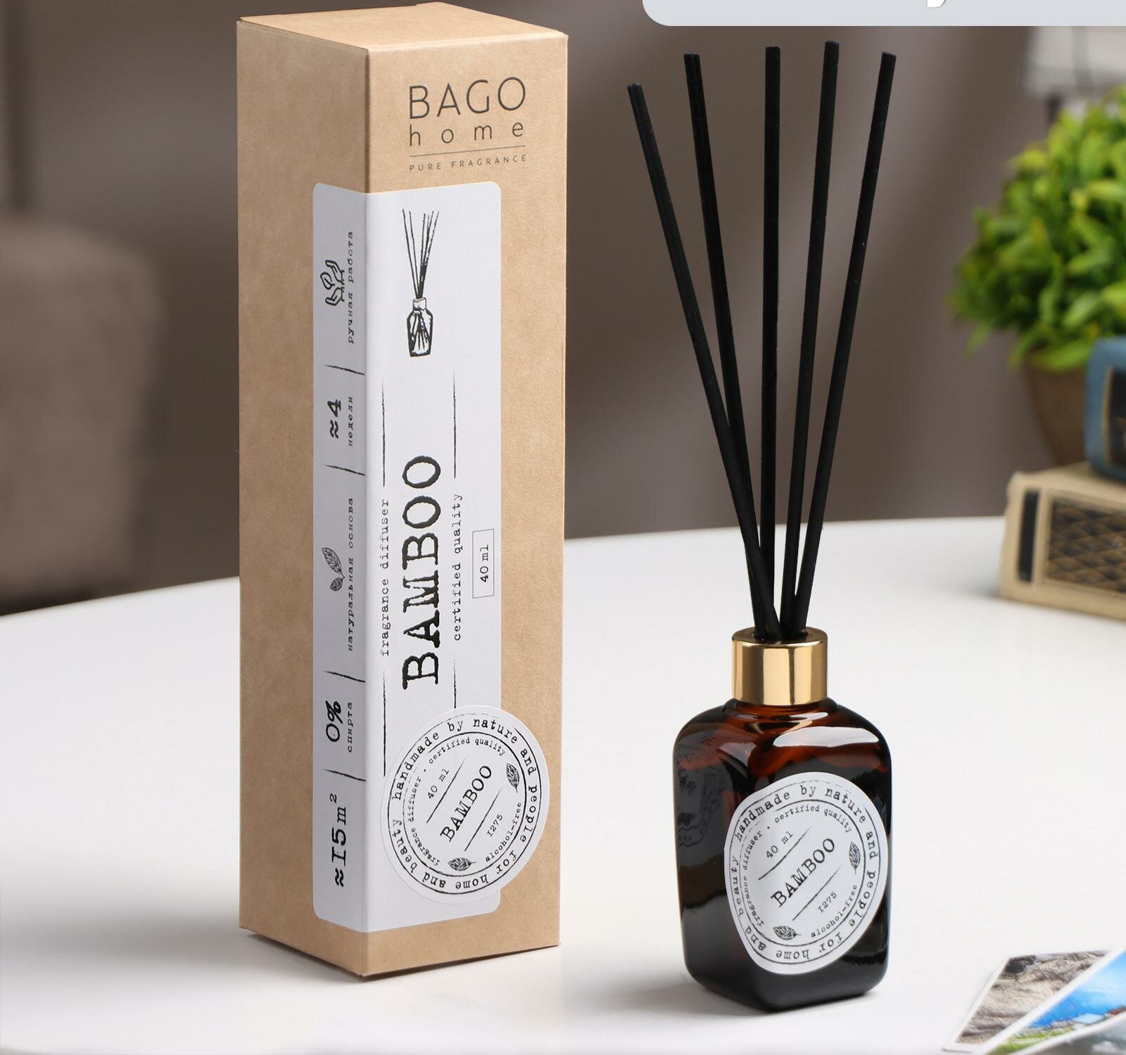 **Ароматический диффузор Bago Home** поможет создать дома или в офисе уютную атмосферу. Приятный запах будет наполнять комнату в течение примерно четырех недель. Комплект состоит из бесспиртовой жидкости с ароматом «Бамбук», помещенной во флакон объемом 40 мл, и палочек. Чем больше палочек вставить в открытый флакон, тем сильнее будет чувствоваться аромат. На время длительного отсутствия в комнате людей можно вытащить палочки и закрыть емкость, чтобы снизить расход жидкости.