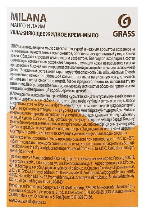 Жидкое крем-мыло Grass Milana «Манго и лайм» 1 л
