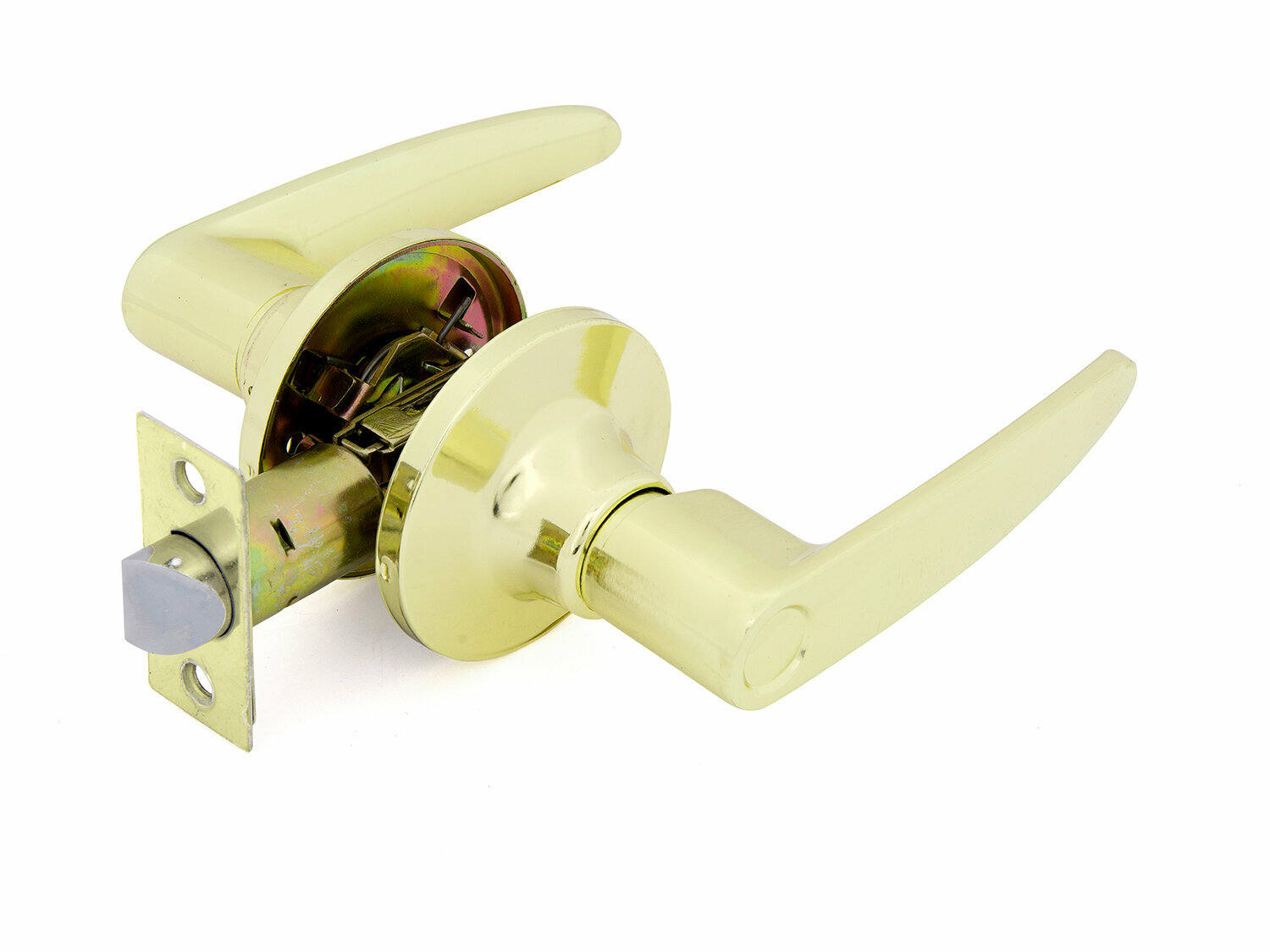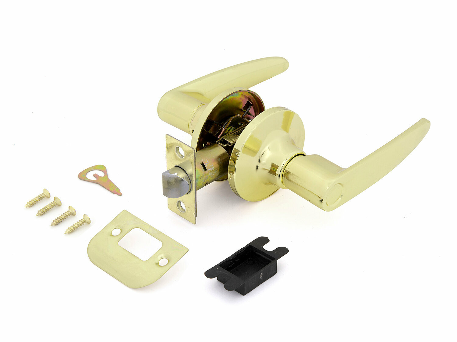 Достоинство этой ручки-защелки – упрощенный монтаж, удобный рычаг с эрго-выемкой под палец, цвет золото. Антикоррозийное покрытие в 6 слоев. Ресурс основных узлов: 200 000 срабатываний. В комплекте: дверные ручки без запирания (2 шт.), защелка, ответная планка, пластиковая вставка под ответную планку, инструментальный ключ, шурупы (4 шт.), стяжные винты (2 шт.).
