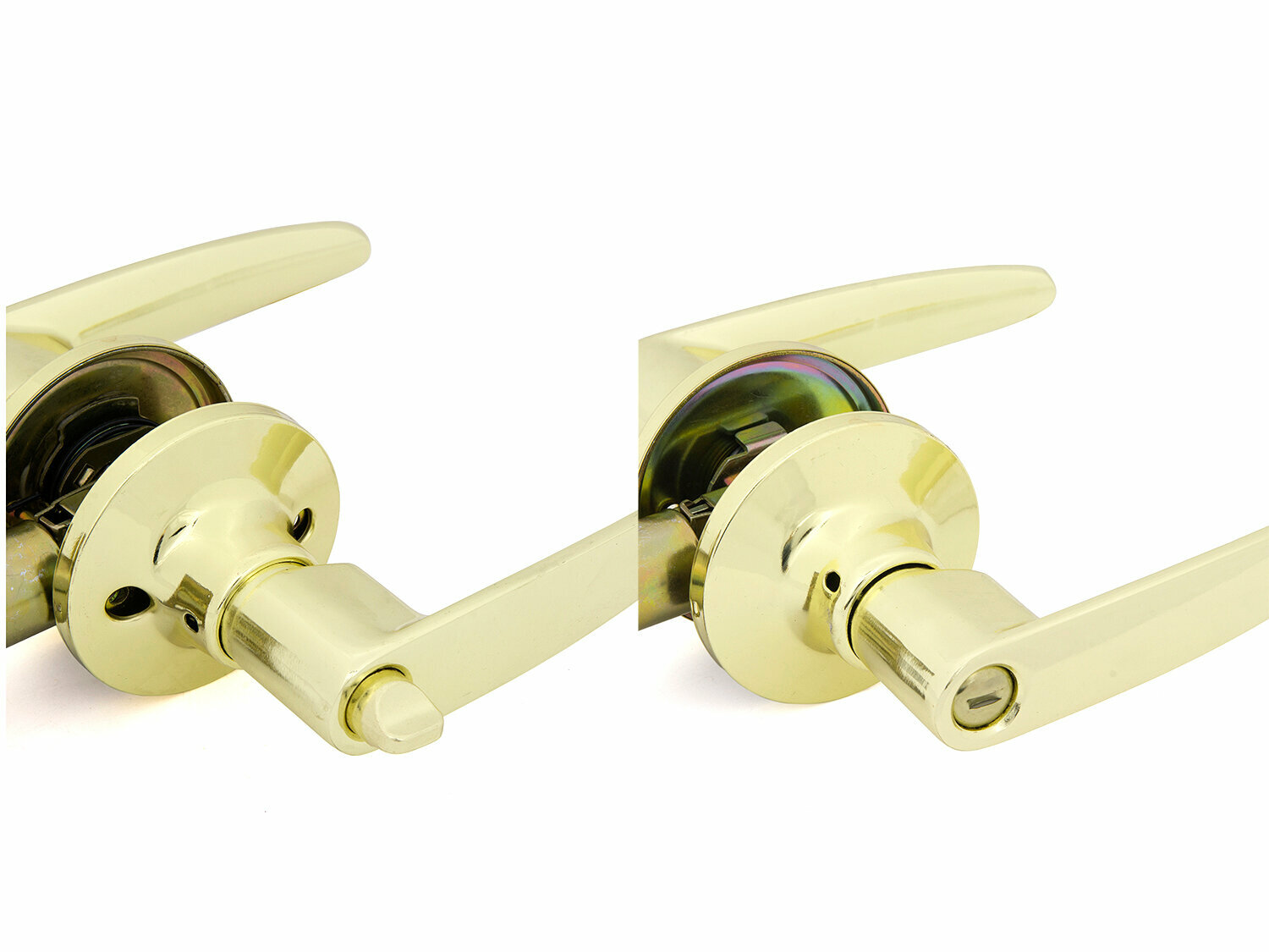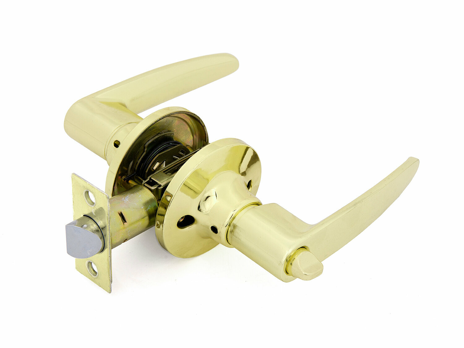 Цвет золото, 6 слоев покрытия (включая двойной слой лака). Влагозащита, стойкость к царапинам и истиранию. Ресурс механизма: не менее 200 000 защелкиваний. В комплекте: дверные ручки с фиксатором (2 шт.), защелка, ответная планка, пластиковая вставка под ответную планку, инструментальный ключ, шурупы (4 шт.), стяжные винты (2 шт.).