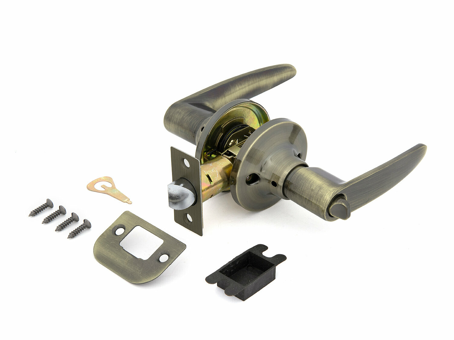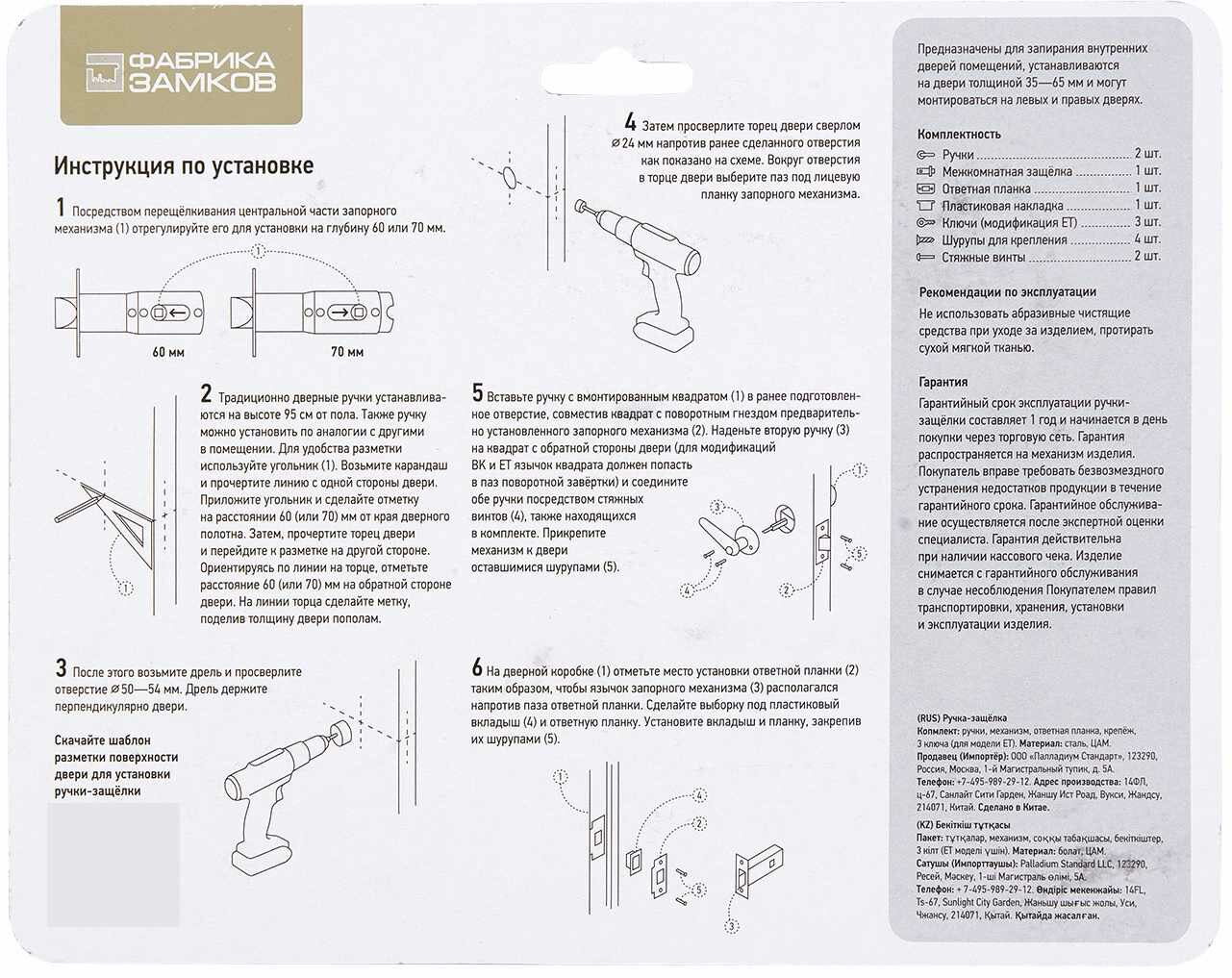 В комплекте: дверные ручки с фиксатором (2 шт.), защелка, ответная планка, пластиковая вставка под ответную планку, инструментальный ключ, шурупы (4 шт.), стяжные винты (2 шт.).