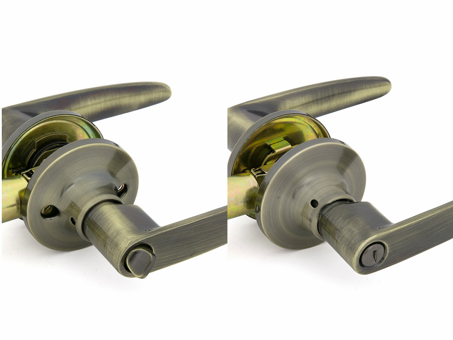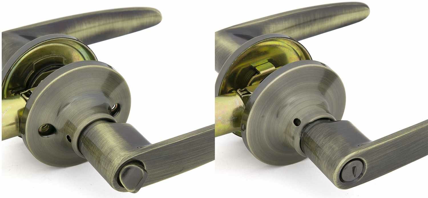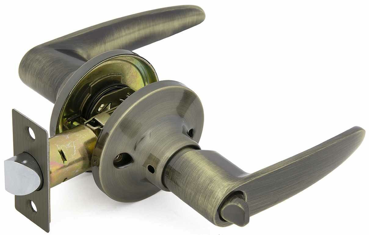 Ручка-защёлка 3502 AB BK – нажимная ручка-защелка с фиксатором для межкомнатных дверей в ванную, туалет или санузел. С помощью такой ручки вы сможете запирать дверь изнутри – достаточно повернуть завертку. На случай застреваний: снаружи предусмотрена прорезь для отпирания двери монетой или другим плоским предметом.