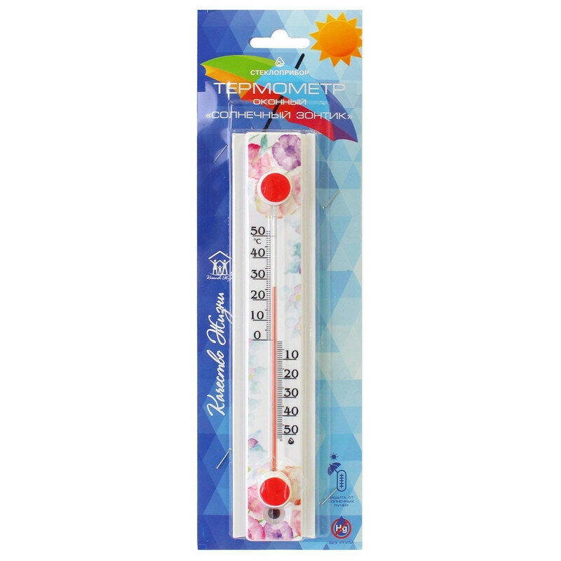 **Термометр оконный "Солнечный зонтик"** предназначен для измерения температуры воздуха на улице в диапазоне от -50°С до +50°С. Термометр оснащен дополнительной планкой, обеспечивающей защиту капилляра от воздействия прямых солнечных лучей и перегрева.