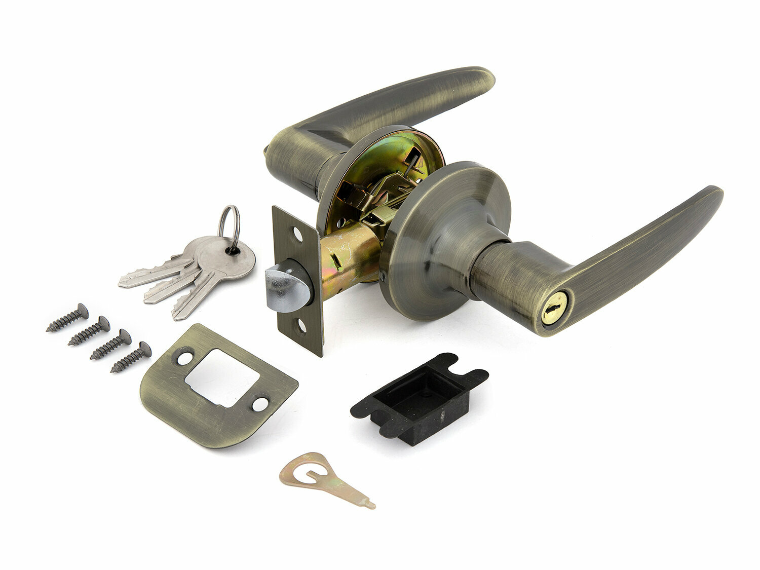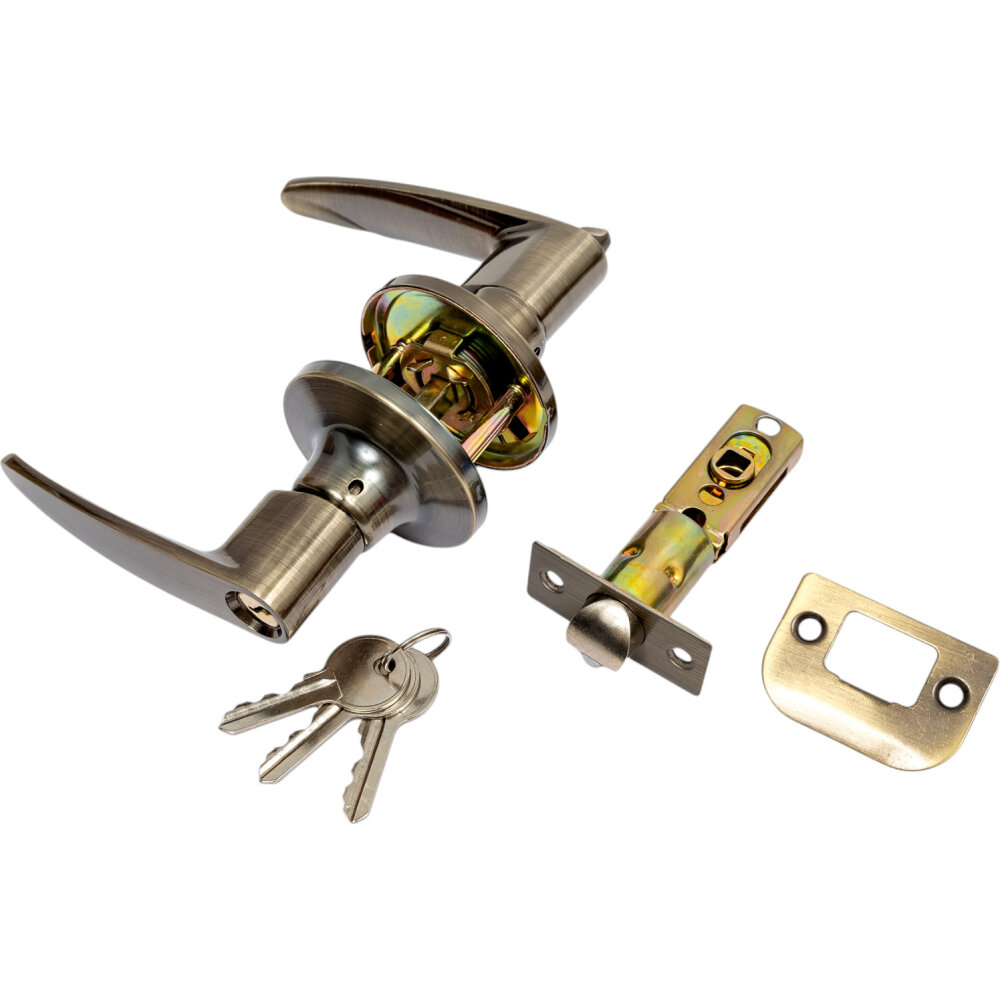В комплекте: дверные ручки с фиксатором (2 шт.), защелка, ответная планка, пластиковая вставка под ответную планку, инструментальный ключ, шурупы (4 шт.), стяжные винты (2 шт.).