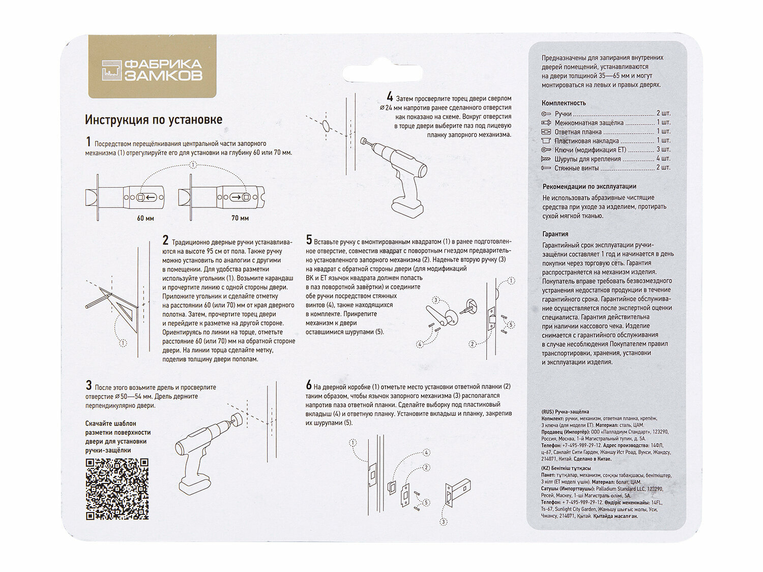 Ручка-защёлка 3502 SN ET – нажимная ручка-защелка с замком с внешней стороны и заверткой с внутренней. Цвет никель, 6 слоев покрытия (включая двойной слой лака). Влагозащита, стойкость к царапинам и истиранию. Ресурс механизма: не менее 200 000 защелкиваний. В комплекте: дверные ручки с фиксатором (2 шт.), защелка, ответная планка, пластиковая вставка под ответную планку, инструментальный ключ, шурупы (4 шт.), стяжные винты (2 шт.).