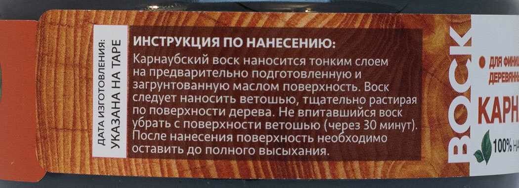 | Состав | Льняное масло, карнаубский воск, сосновая смола (живица), пчелиный воск, скипидар живичный (двойной очистки), сиккатив (без свинца) |