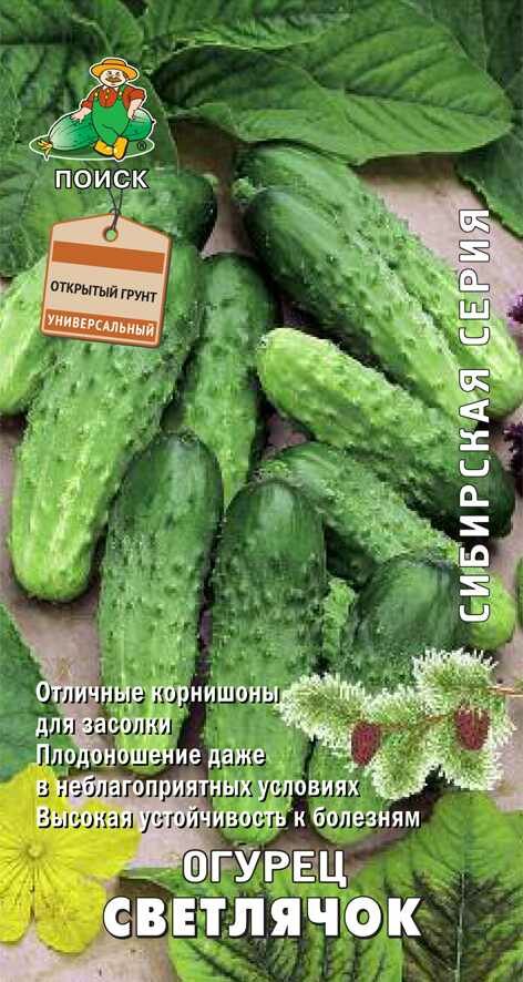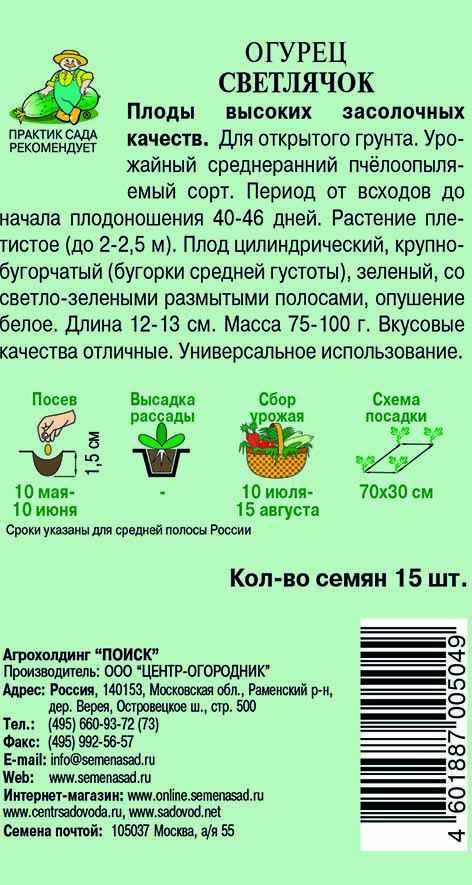**Огурец «Светлячок»** — пчелоопыляемый урожайный сорт ранней спелости, рекомендован для выращивания в открытом грунте. Начинает плодоносить на 40-46 день от появления всходов, урожайность высокая. Плоды крупнобугристые с плотной мякотью, без пустот. Вырастают до 12-13 см в длину, набирают массу 75-100 г, подходят для консервирования и употребления в свежем виде.