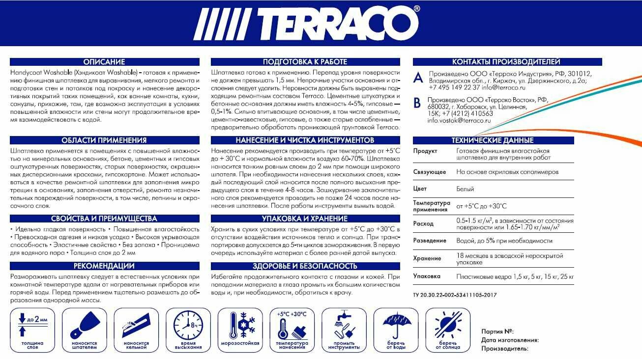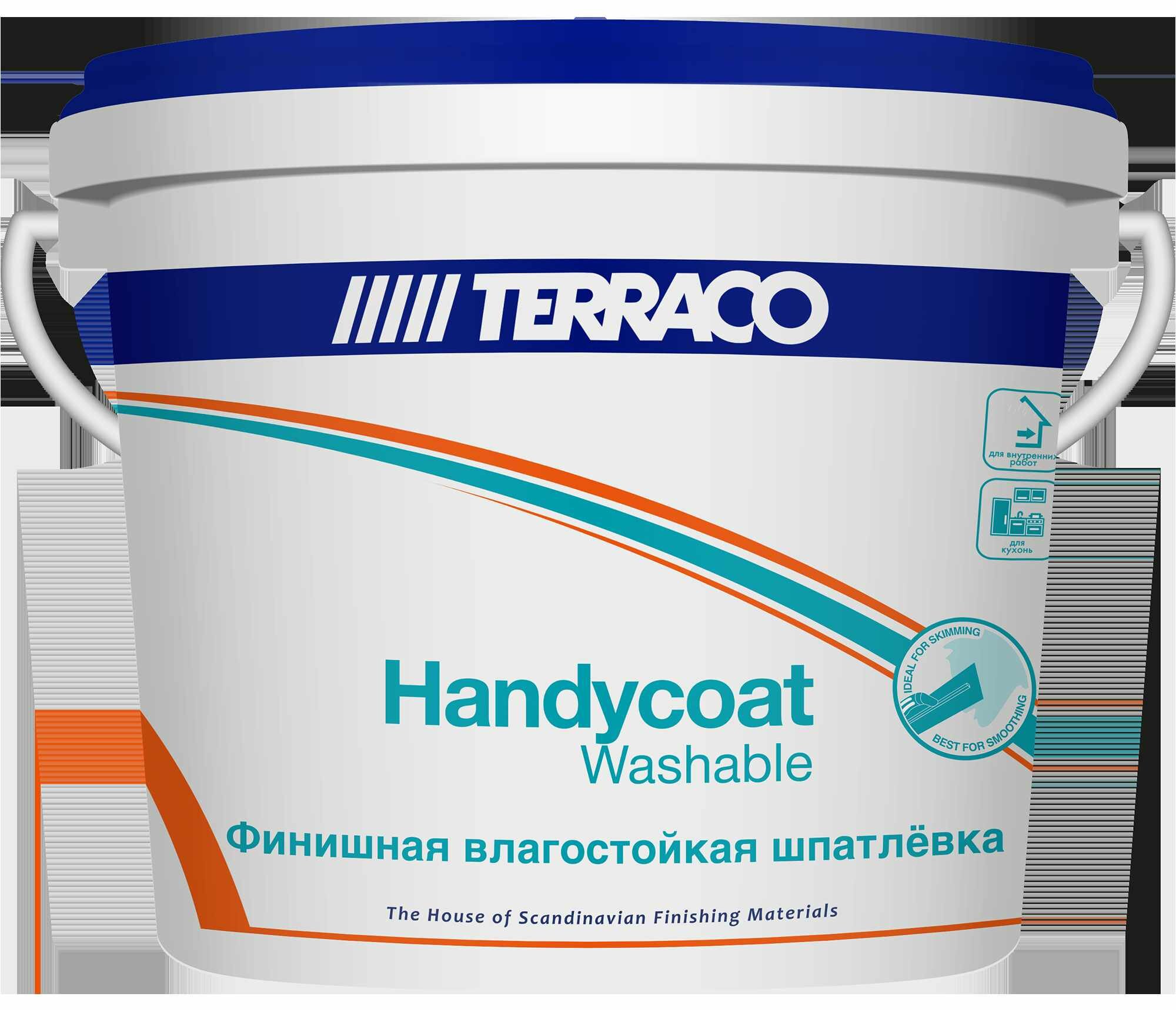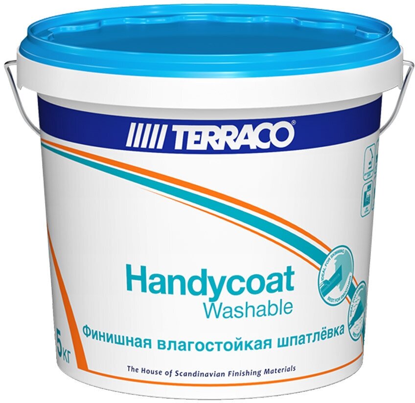 **Шпатлёвка финишная влагостойкая Terraco Handycoat Washable** предназначена для внутренних работ по подготовке стен к декоративной отделке. Белый материал на основе акриловых полимеров обладает пластичной однородной структурой, благодаря которой легко распределяется по поверхностям с помощью шпателя. Он позволяет выравнивать стены и маскировать их небольшие дефекты.