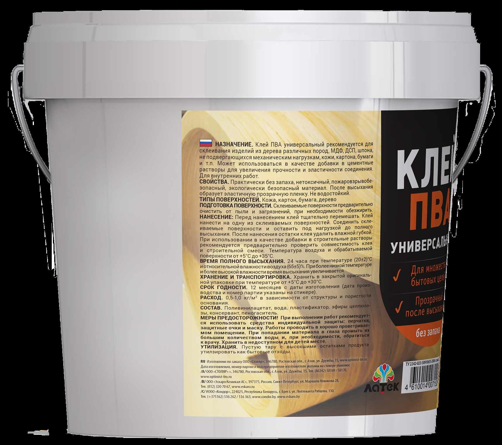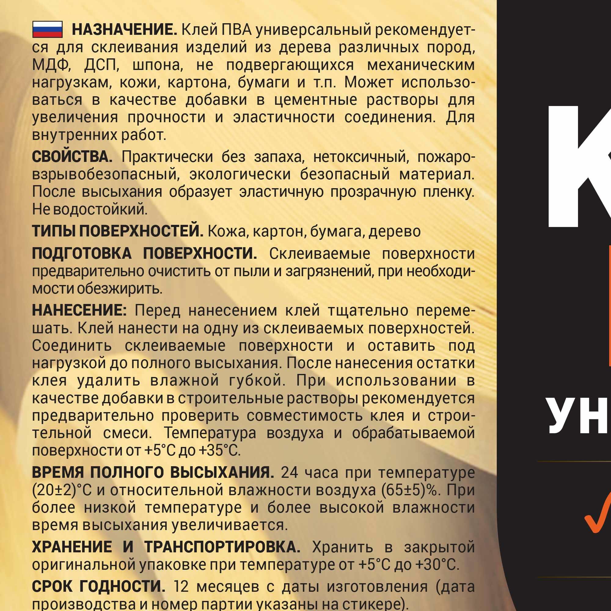 **Клей ПВА для внутренних работ** применяется в бытовой и промышленной сферах. Он предназначен для надежного склеивания изделий из дерева, применяется для обивочных материалов, бумаги, картона, приготовления строительных смесей на водной основе. При нанесении на поверхность он приобретает прозрачный цвет, поэтому незаметен на конструкциях из разных пород древесины. Основное действующее вещество состава — поливинилацетат, который используется для горизонтального и вертикального приклеивания.