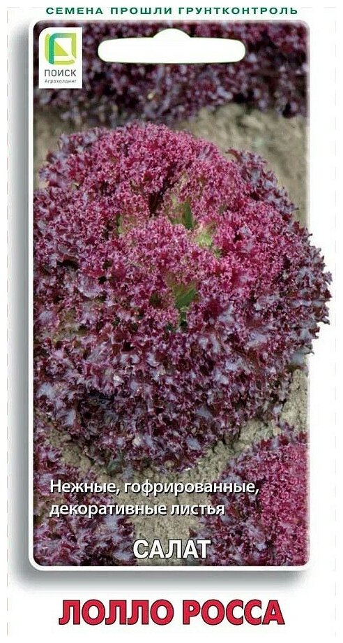 **Салат «Лолло Россо»** — оригинальный листовой сорт со средними сроками созревания (около 45 дней). Формирует рыхлую розетку гофрированных листьев среднего размера, нежной и хрустящей пластиной. Диаметр розетки — до 25 см, масса одного куста — до 325 г. Посев в открытый грунт в мае, сбор урожая в июне — июле.