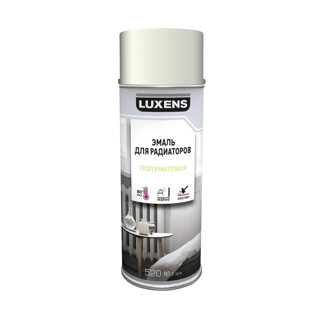 **Эмаль аэрозольная для радиаторов Luxens** обладает кремовым цветом с сатинированным эффектом. Она предназначена для защитно-декоративного покрытия батарей, труб и других металлических поверхностей, которые подвергаются нагреву до 80°С. Особенностью состава стала возможность его нанесения прямо на ржавчину. Эмалевая аэрозольная краска на основе растворителя используется в гаражах, подвалах, гардеробной комнате и на кухне.
