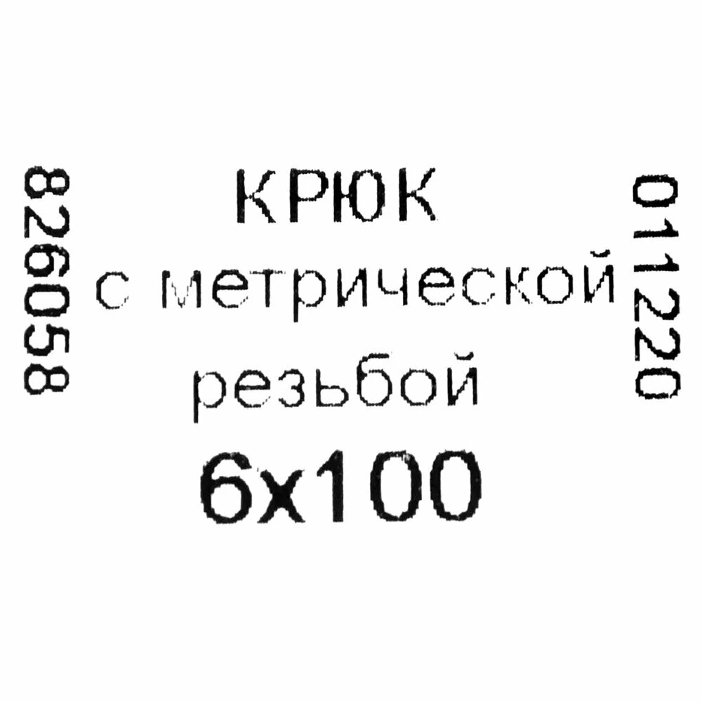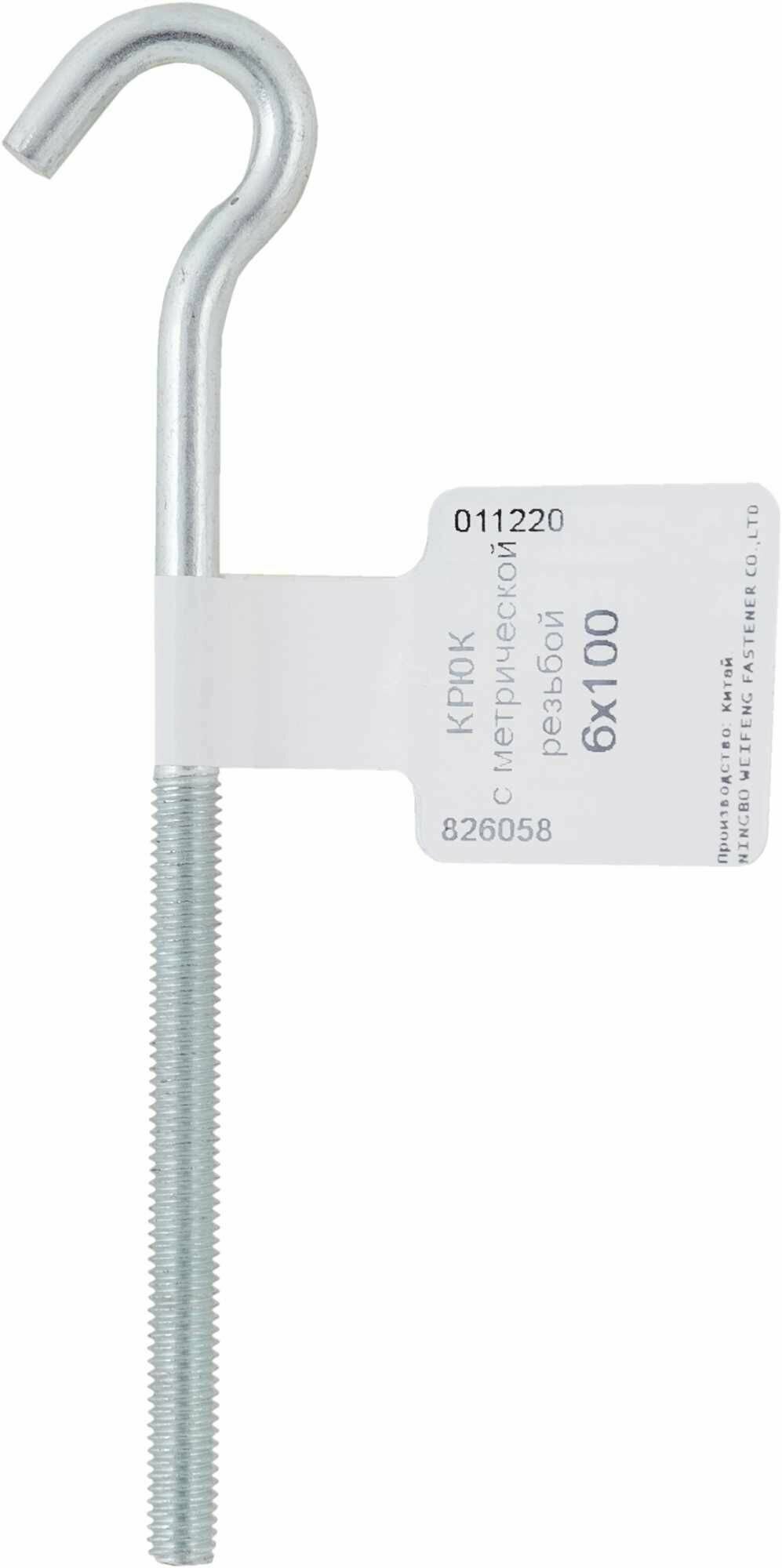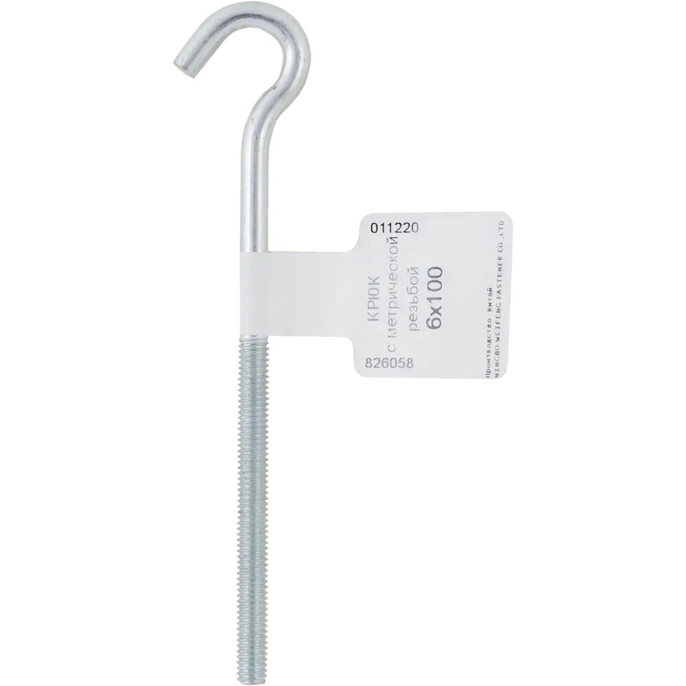**Крюк с метрической резьбой** — металлический крепежный элемент для монтажа люстр, качелей, подвесных предметов мебели и иных объектов. Имеет форму стержня с полукольцом на одном конце и резьбой на другом. Крюк изготовлен из оцинкованной стали, имеет длину 100 мм и сечение 6 мм. В упаковке — 1 шт. Товар произведен в Китае.