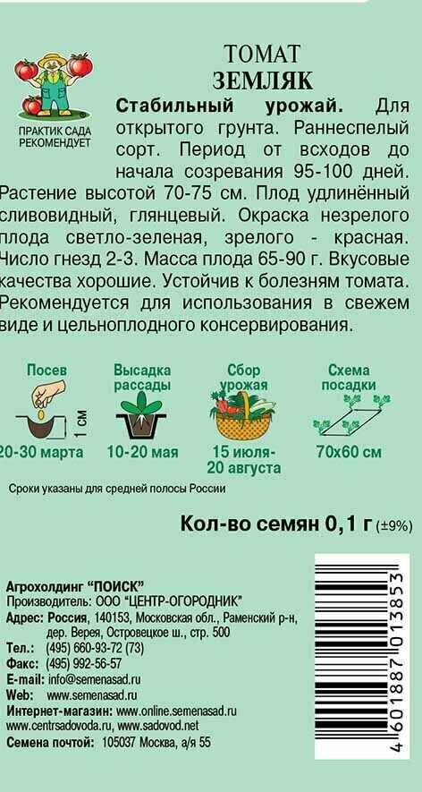 **Томат «Земляк»** — раннеспелый детерминантный сорт. Плоды красные, сливовидной формы, весом 65-90 г. Использование — свежими в салатах и гарнирах. Хороши для цельноплодного консервирования. Сорт ценится за отличный вкус, сочную мякоть и богатый витаминно-минеральный состав.