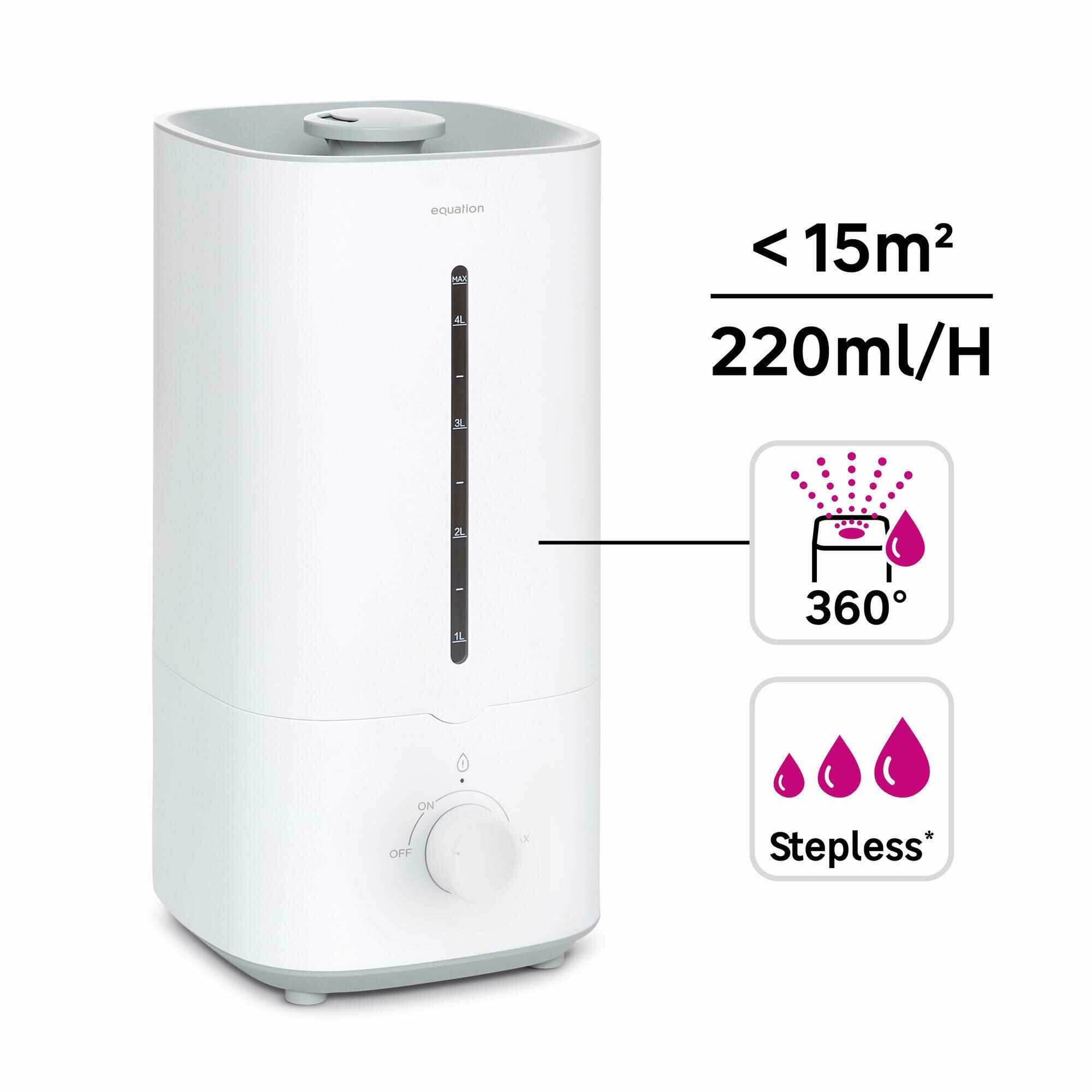 **Увлажнитель воздуха Equation** объемом 4,5 л подходит для обработки помещений площадью до 15 м². Кнопки управления расположены на фронтальной части модели. Сверху встроена крышка, закрывающая резервуар для воды. Работает от сети переменного тока. Не подходит для интеграции в систему «Умный дом».