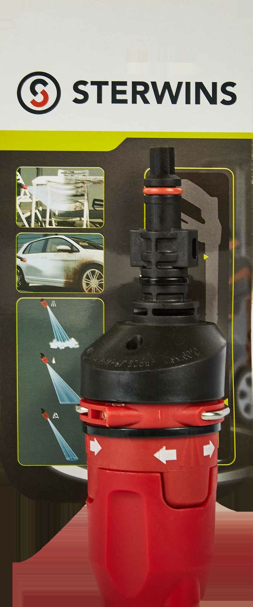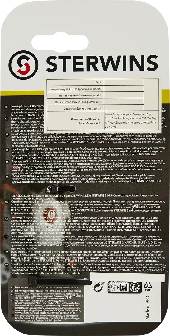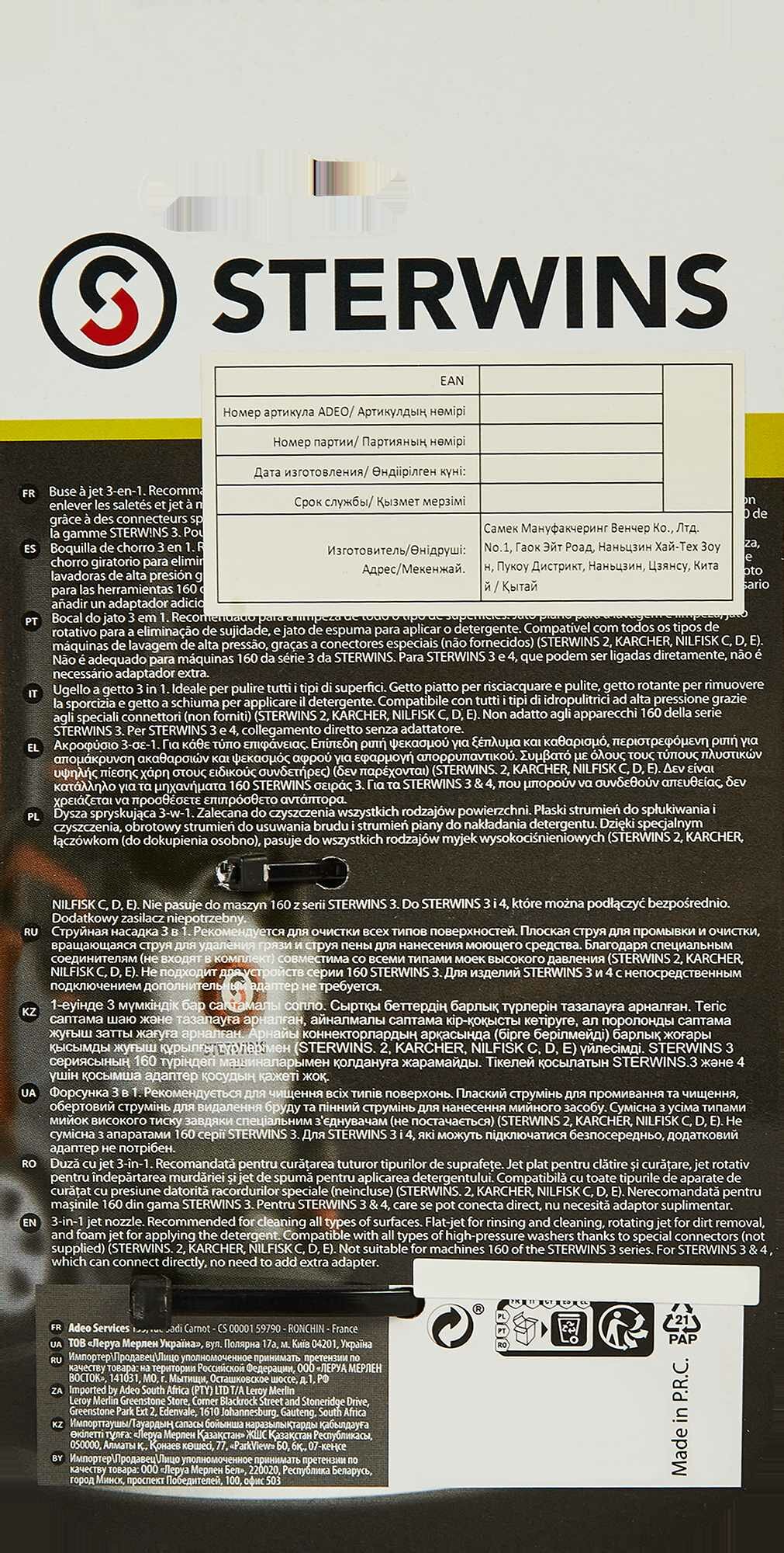 **Насадка для мойки высокого давления Sterwins NZ3J EPW.4** предназначена для очистки всех типов поверхностей, в том числе плитки, стен, террас. Одна насадка обеспечивает работу трех струй. Плоская струя используется для промывки и очистки, вращающаяся удаляет грязь, пена позволяет нанести моющее средство. Изделие совместимо с мойками высокого давления Sterwins, Karcher, Nilfisk C, D, E.