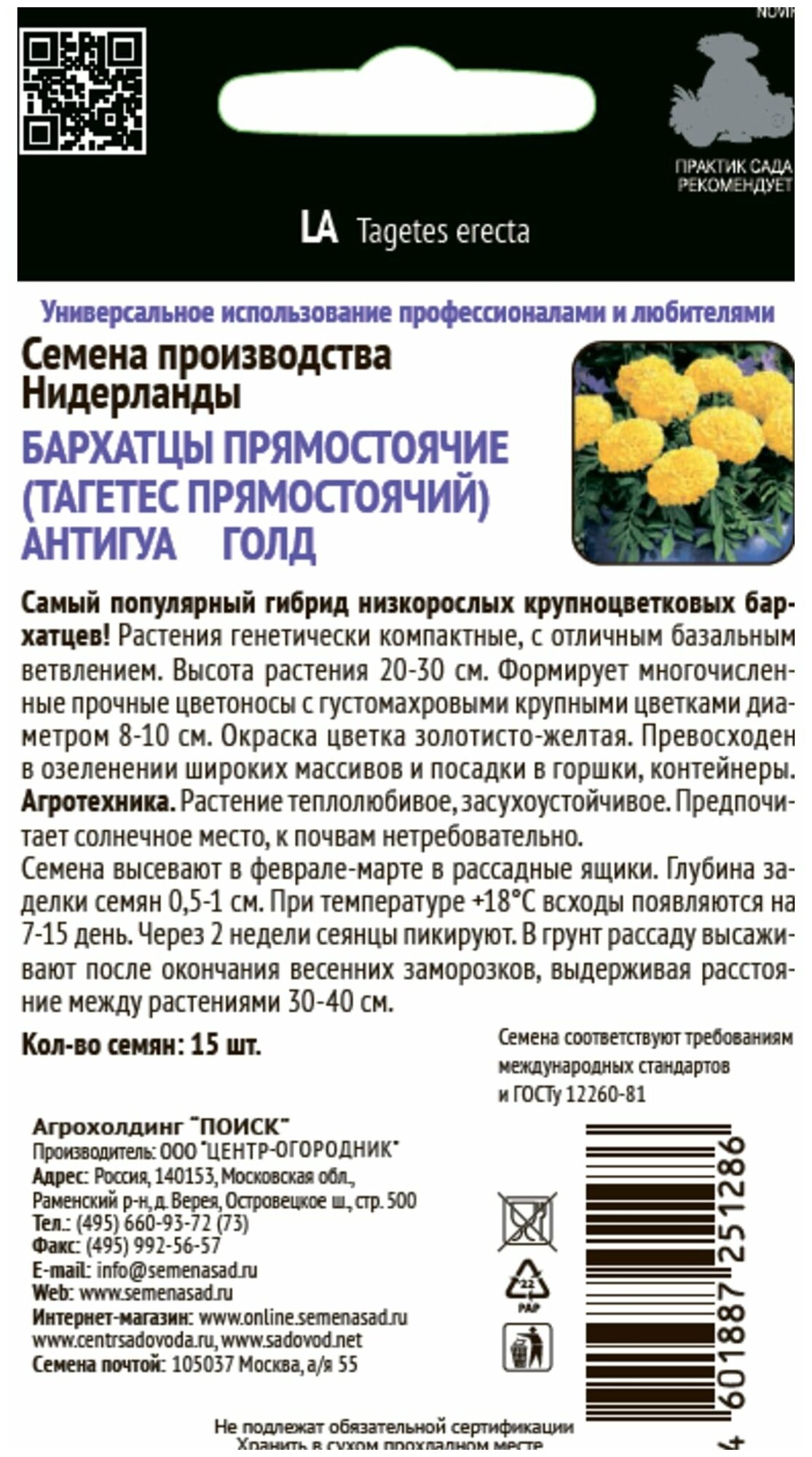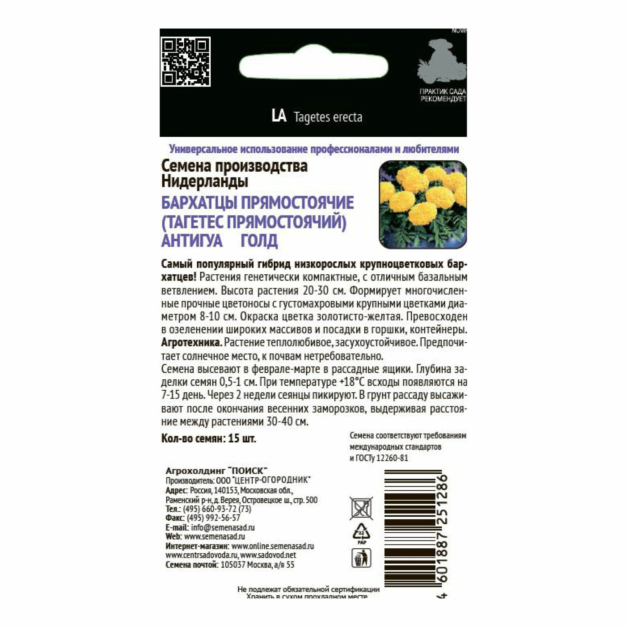 Бархатцы прямостоячие Антигуа Голд 15 шт. ПОИСК