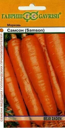 **Морковь «Самсон»** — высокоурожайный (до 5,3-7,5 кг/м²) голландский гибрид, сортотип Нантская. Среднеспелый — со дня появления всходов до уборки урожая проходит 110-120 суток, отличается хорошими вкусовыми качествами. Дает цилиндрические красно-оранжевые с интенсивным наливом корнеплоды длиной до 20 см. Средняя масса — 130 г.
