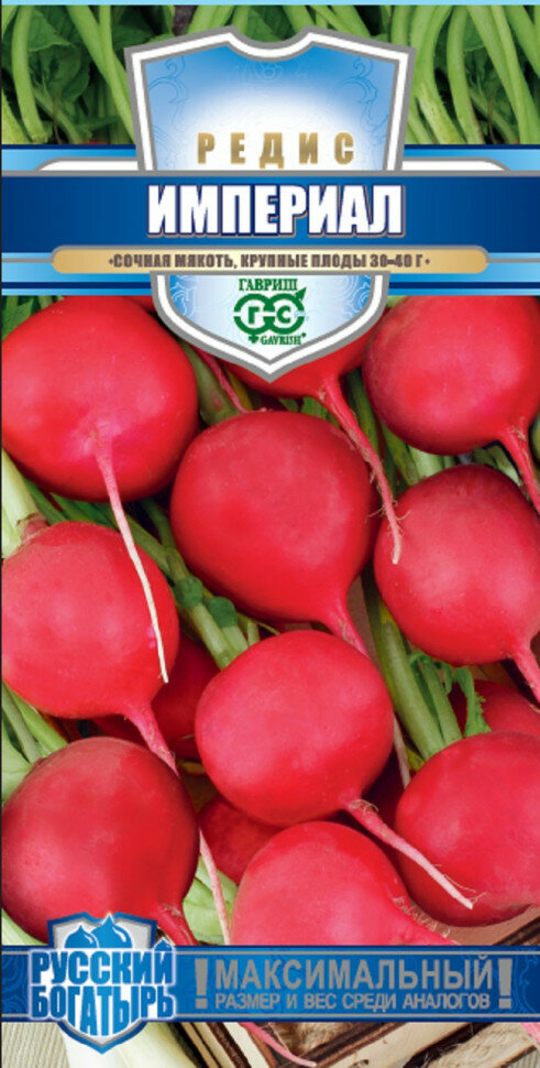 **Редис «Империал»** относится к среднеспелым — техническая зрелость наступает через месяц после всходов. Корнеплод красный, округлой формы, очень крупный (диаметром 8-10 см, весом 30-40 г). Мякоть белая, хрустящая, богата клетчаткой. Вкус сладковато-острый, отменного качества. Идеален для нарезки, окрошки, салатов. Можно готовить закуски и бутерброды.