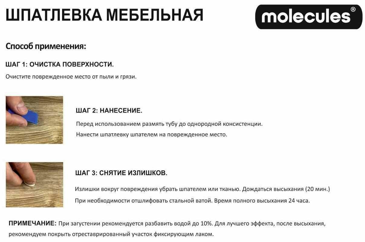 **Шпаклевка мебельная со шпателем Molecules** — это набор для устранения значительных повреждений мебели. Она применяется для выравнивания отверстий и сколов, маскировки вмятин, восстановления углов на паркетной доске или ламинате. Шпаклевка применяется на поверхностях ЛДСП, деревянных конструкциях, которые подвергаются интенсивной эксплуатации.