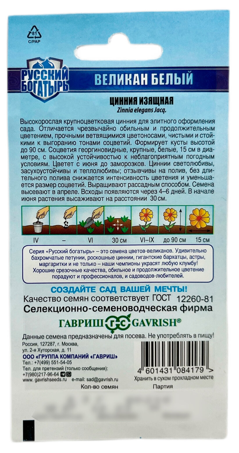 Сервис сравнения цен СкидкаГИД предлагает сравнить цены на товар «Цинния Великан белая серия Русский богатырь 0.3 г ГАВРИШ»