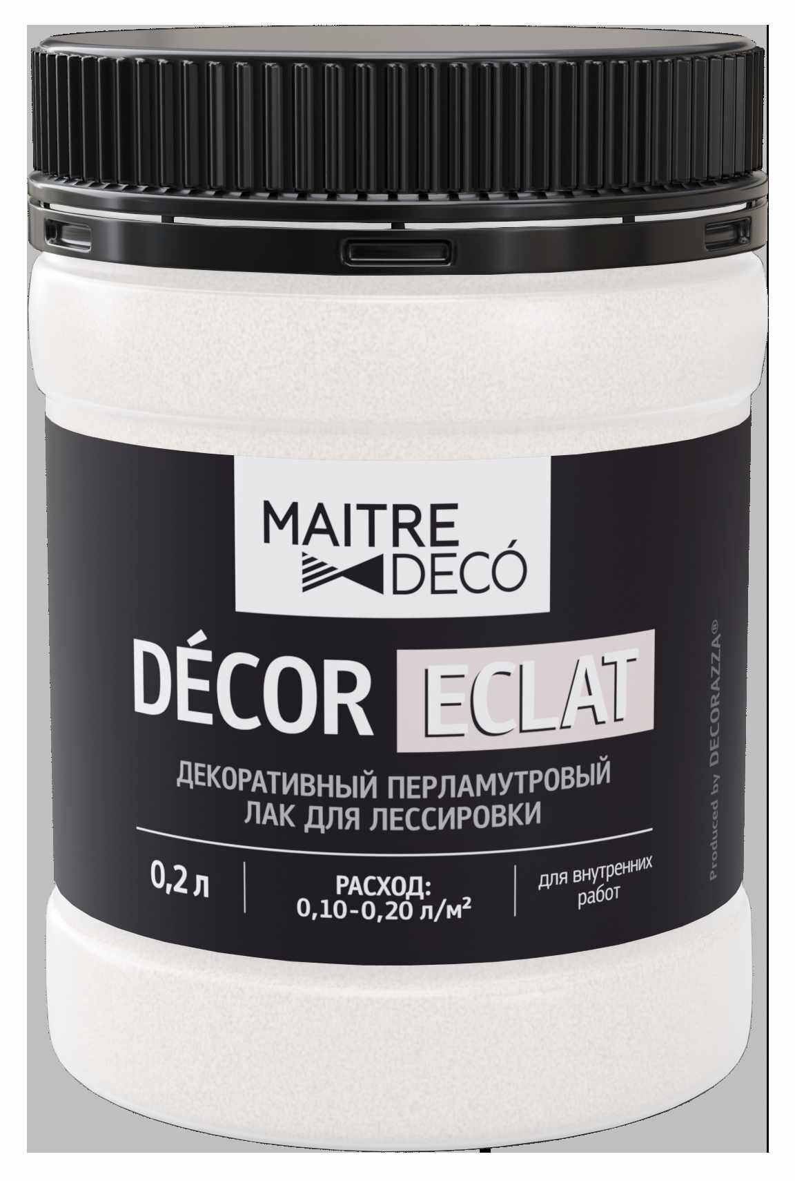 **Лак перламутровый Maitre Deco «Decor Eclat»** используется для придания жемчужного перелива поверхности. Предназначен для обработки пенополистирольных и полиуретановых изделий, подходит для нанесения практически на любые предварительно подготовленные минеральные основания (бетон, бетонные блоки, кирпичная кладка, цемент, цементная штукатурка, гипсовые и гипсокартонные плиты), ДСП, ДВП, а также на все типы обоев под покраску. В результате нанесения получается полупрозрачный жемчужный перелив с перламутровым сиянием на финишном слое.