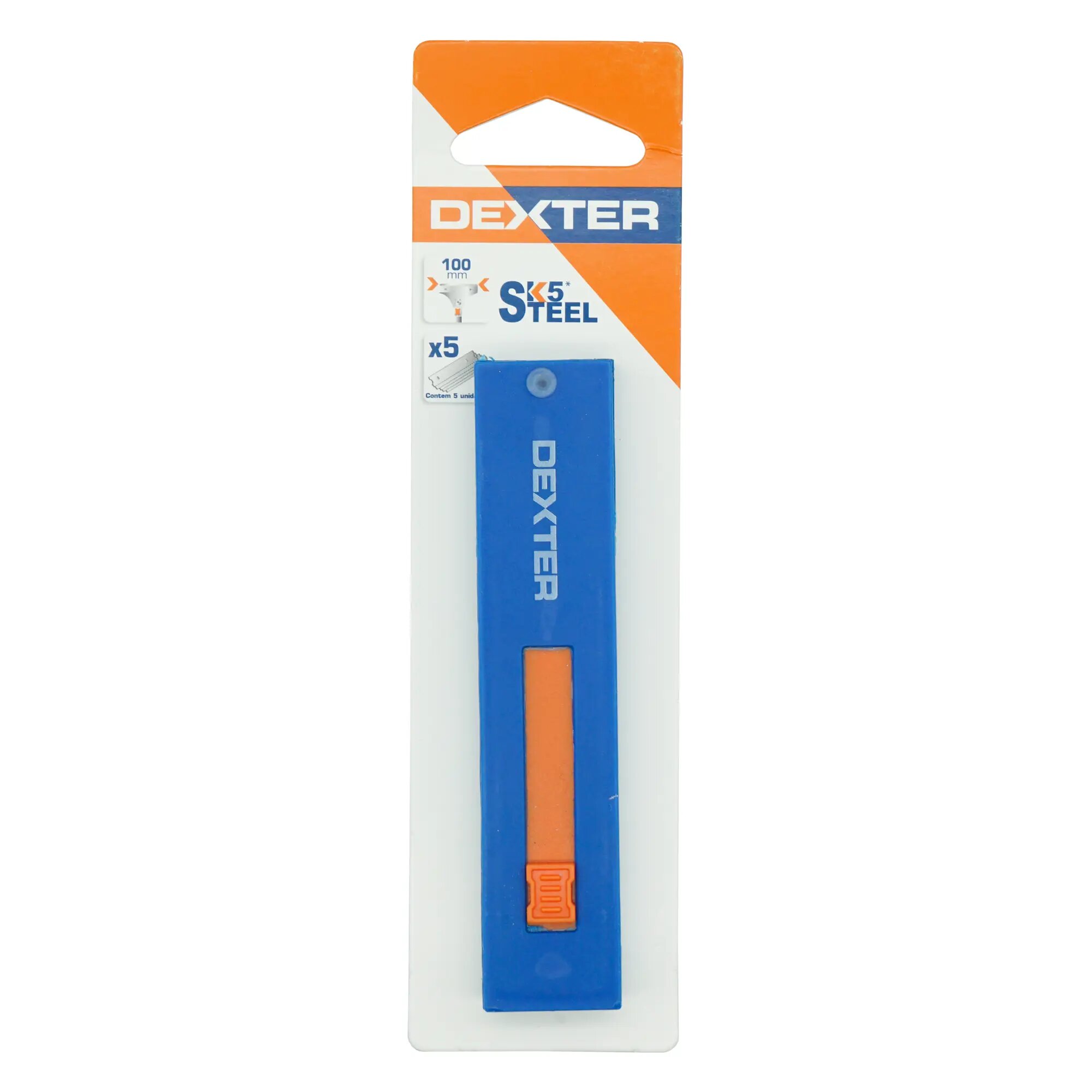 **Лезвие для скребка Dexter** предназначено для удаления следов краски или клея со стеклянной, керамической или деревянной поверхности. В комплект входит 5 лезвий, они совместимы со всеми типами скребков, для которых требуются лезвия длиной 100 мм. Пластиковый кейс идеально подходит для хранения и позволяет избежать любого риска опасного обращения. Материал полотна — SK5 (японская инструментальная сталь).