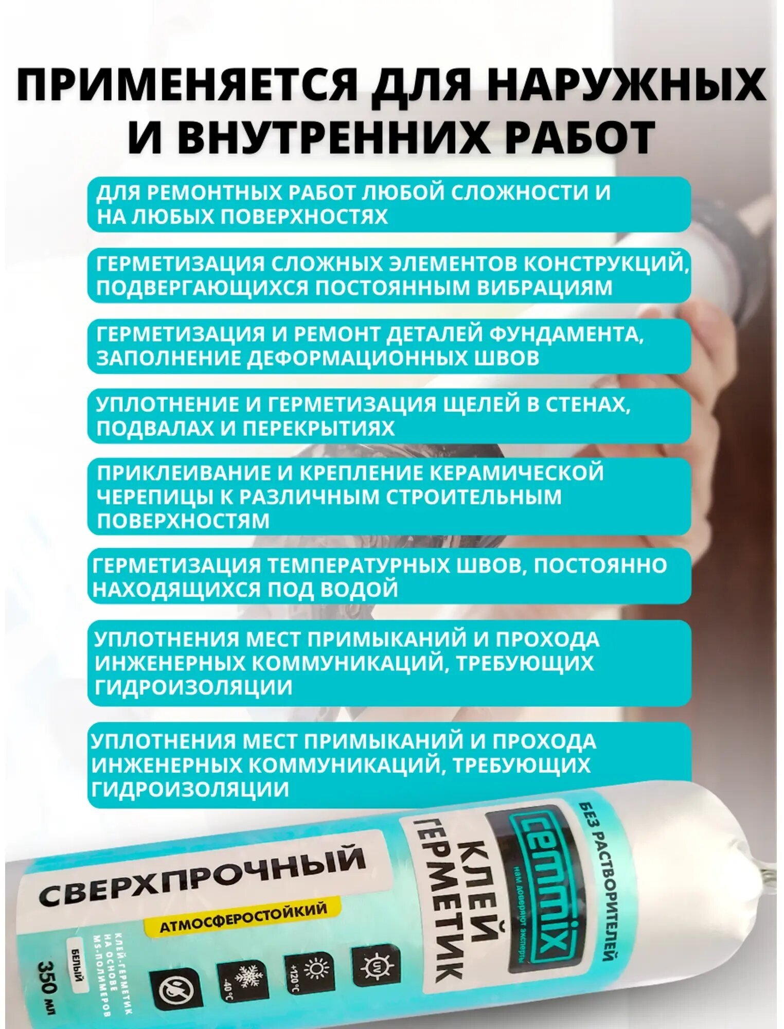 - возможно нанесение герметика даже при отрицательной температуре — до -15°C;