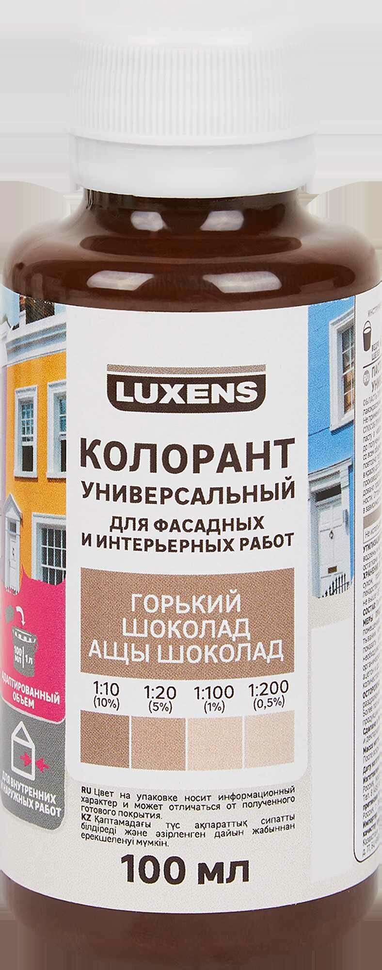 **Колорант Luxens** отличается универсальностью, подходит как для фасадных, так и для интерьерных работ. С его помощью можно создать эффектное мерцающее покрытие при колеровании лаков, пропиток и составов, предназначенных для декорирования и защиты деревянных поверхностей. Вводить требуется в колеруемый лакокрасочный материал до 10% колеровочной пасты. Прежде чем воспользоваться получившимся средством, обязательно протестируйте его на небольшом участке поверхности.