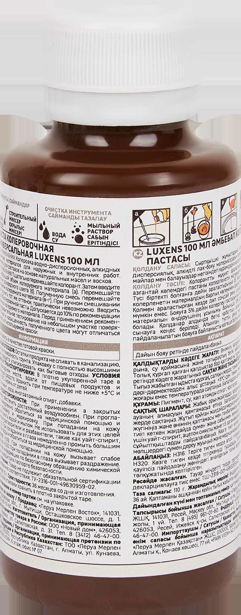 | Инструкция по применению | СПОСОБ ПРИМЕНЕНИЯ Тщательно перемешайте пасту. Затем введите пасту в небольшом объеме колеруемого материала. Перемешайте до получения однородного цвета. Полученную смесь перемешайте со всем объемом колеруемого материала. При ручном смешивании повторно получить тот же оттенок практически невозможно. Вводить в краску до 5% колеровочной пасты. Допускается до 10% по рекомендации производителя колеруемого материала. Перед применением рекомендовано предварительное тестирование на небольшом участке поверхности. Оттенок и насыщенность полученного цвета могут отличаться в зависимости от используемой краски. ИНФОРМАЦИЯ Не использовать как самостоятельное красящее средство. УТИЛИЗАЦИЯ ОТХОДОВ: Остатки продукта не сливать в канализацию, Водоемы и на поверхность грунта. Упаковку с полностью высохшими остатками продукта утилизировать как бытовой мусор. |