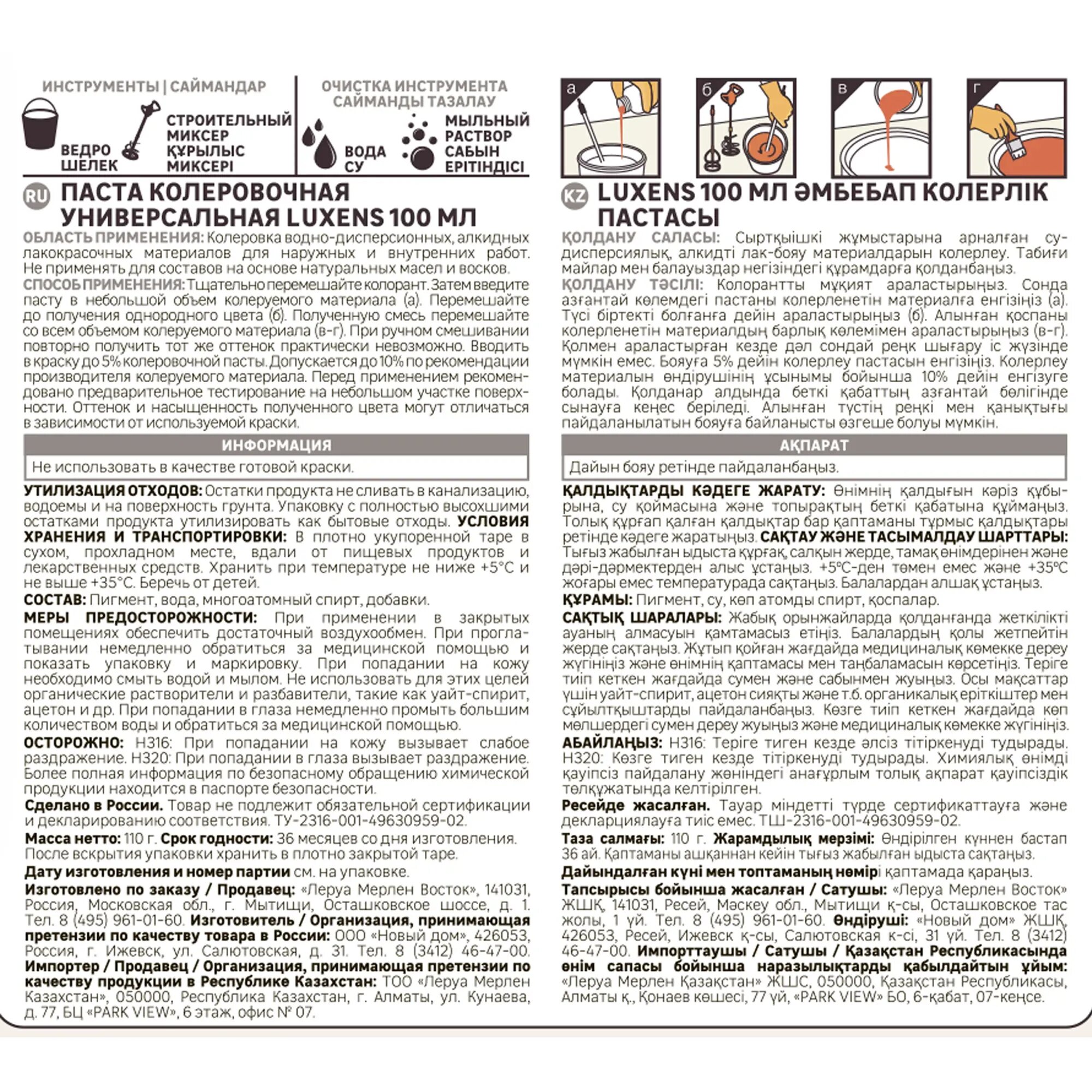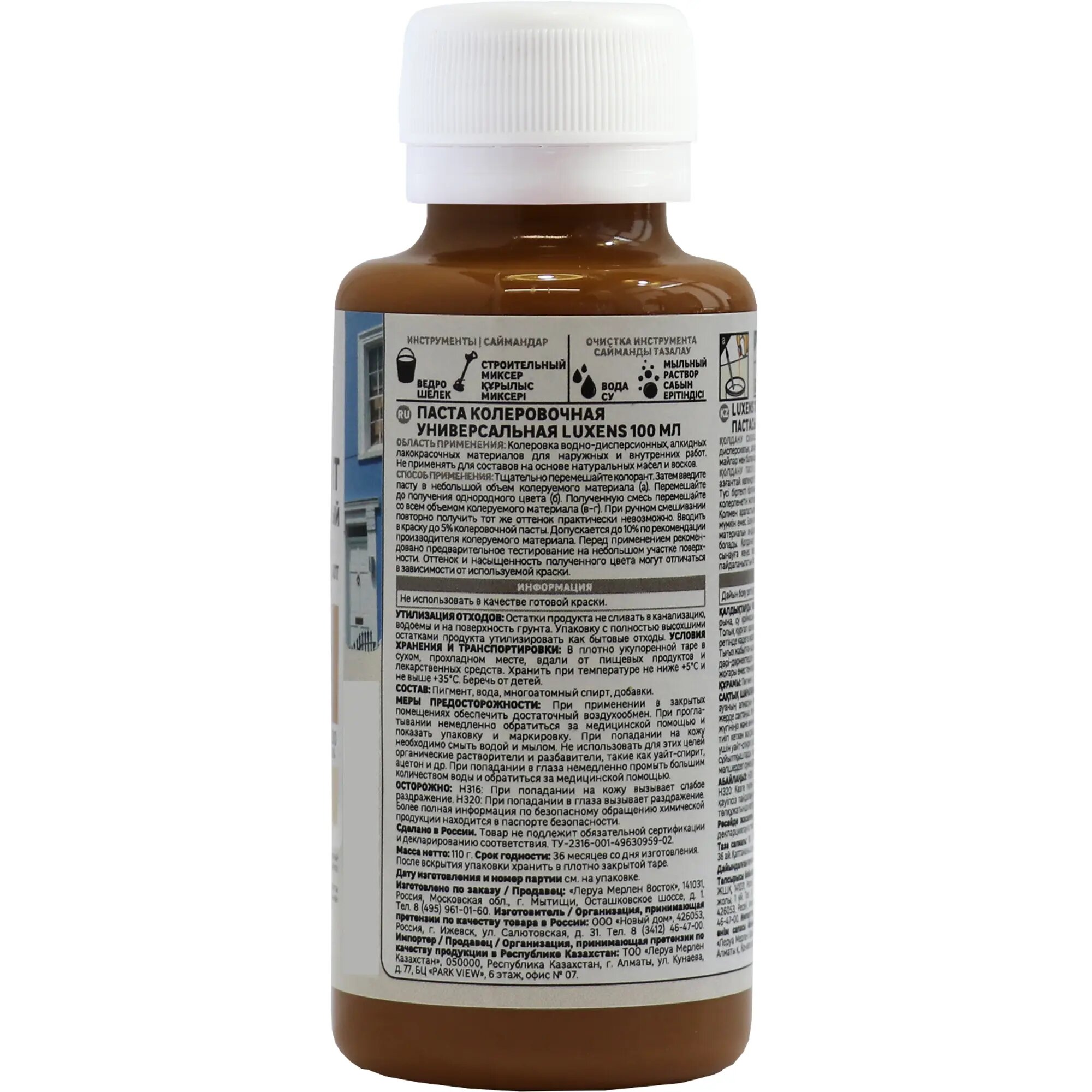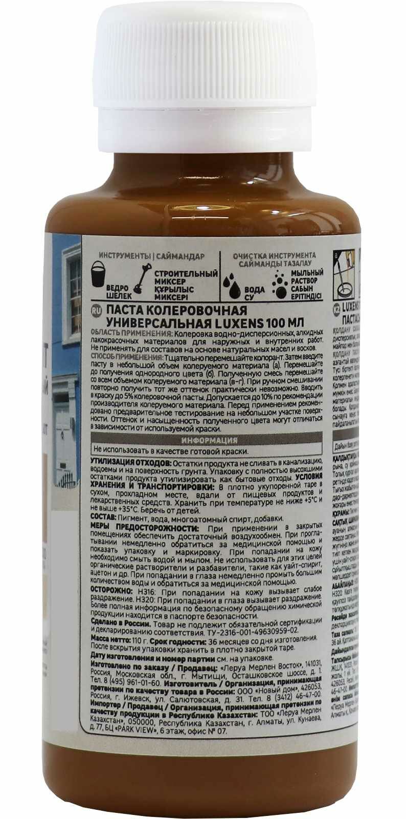 | Инструкция по применению | СПОСОБ ПРИМЕНЕНИЯ Тщательно перемешайте пасту. Затем введите пасту в небольшом объеме колеруемого материала. Перемешайте до получения однородного цвета. Полученную смесь перемешайте со всем объемом колеруемого материала. При ручном смешивании повторно получить тот же оттенок практически невозможно. Вводить в краску до 5% колеровочной пасты. Допускается до 10% по рекомендации производителя колеруемого материала. Перед применением рекомендовано предварительное тестирование на небольшом участке поверхности. Оттенок и насыщенность полученного цвета могут отличаться в зависимости от используемой краски. ИНФОРМАЦИЯ Не использовать как самостоятельное красящее средство. УТИЛИЗАЦИЯ ОТХОДОВ: Остатки продукта не сливать в канализацию, Водоемы и на поверхность грунта. Упаковку с полностью высохшими остатками продукта утилизировать как бытовой мусор. |