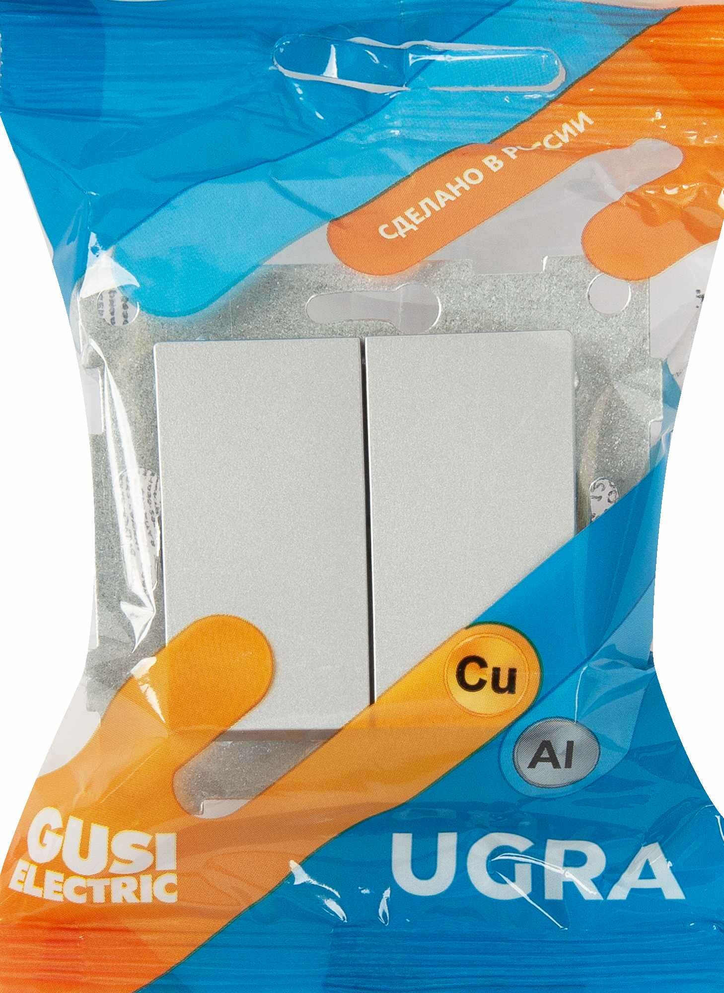 **Выключатель встраиваемый Gusi Electric** предназначен для 2 цепей источников освещения. Совместим с электропроводкой из меди или алюминиевого сплава 8 серии. Встраивается в монтажную коробку или полость. Монтировать можно как на распорные лапки, так и на винты (резьба М3.5). Корпус изготовлен из негорючего пластика, контакты из биметалла. Цвет корпуса — серебро.