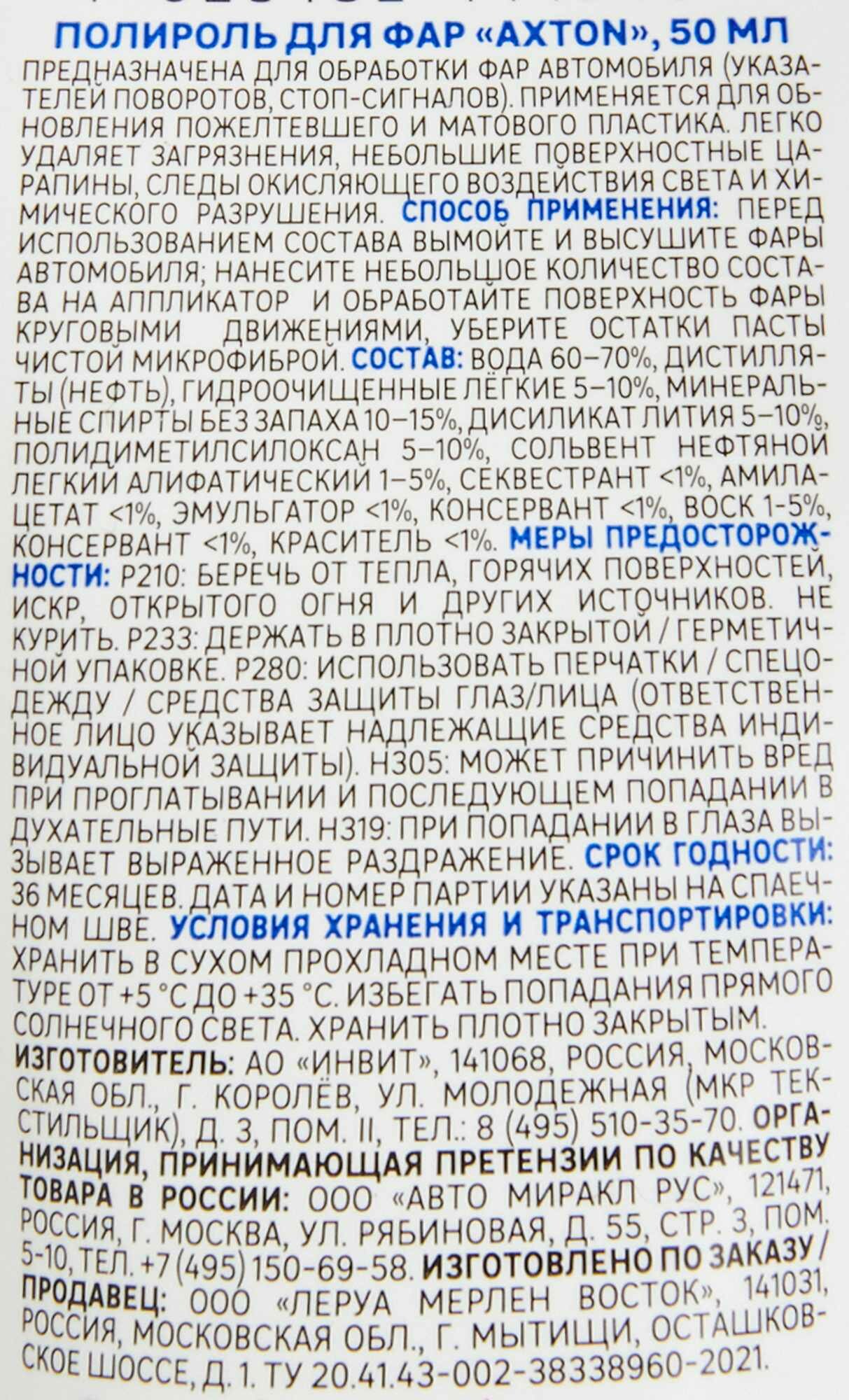 **Полироль для фар Axton** предназначен для обработки фар автомобиля (указателей поворотов, стоп-сигналов). Применяется для обновления пожелтевшего и матового пластика. Легко удаляет загрязнения, небольшие поверхностные царапины, следы окисляющего воздействия света и химического разрушения.