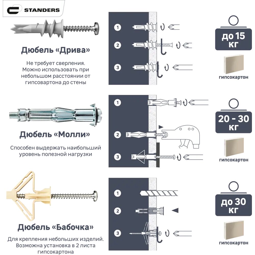 - Полезная нагрузка гипсокартон 1 лист 12,5 мм - до 15 кг, гипсокартон 2 листа 12,5 мм - до 25 кг;