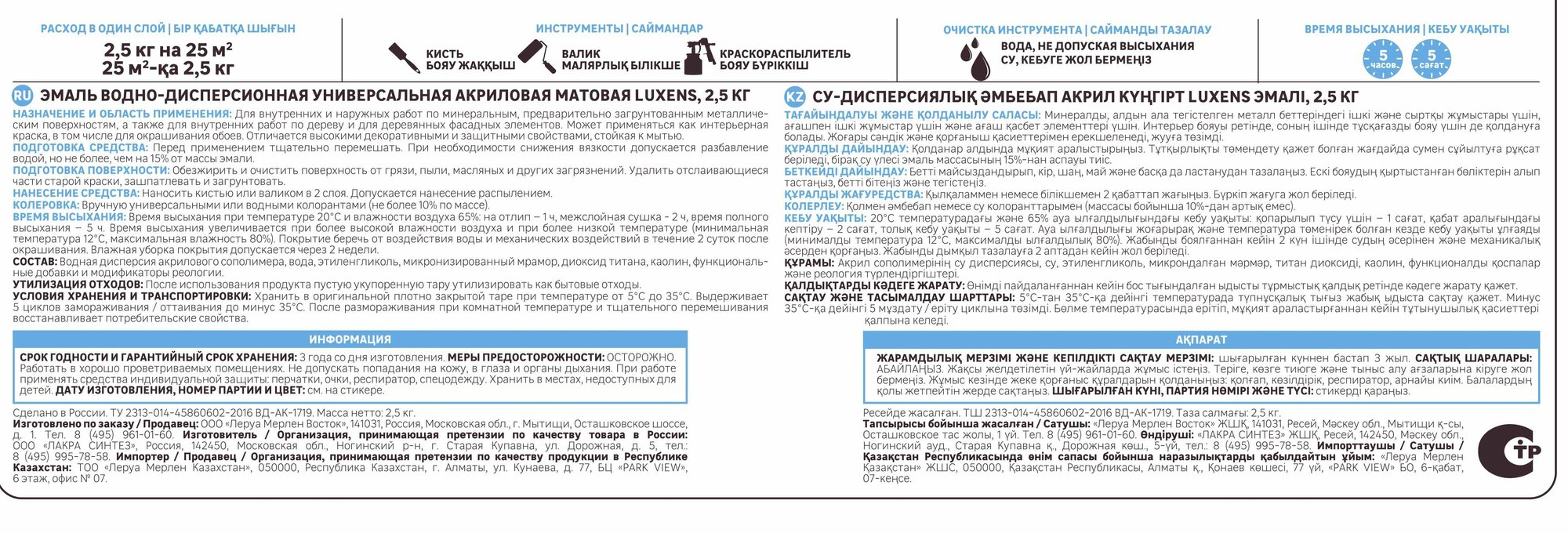 **Время высыхания** при температуре 20˚С и влажности воздуха 65%: на отлип – 1 ч, межслойная сушка – 2 ч, время полного высыхания – 5 ч. Время высыхания увеличивается при более высокой влажности воздуха и при более низкой температуре (минимальная температура 12˚С, максимальная влажность 80%).