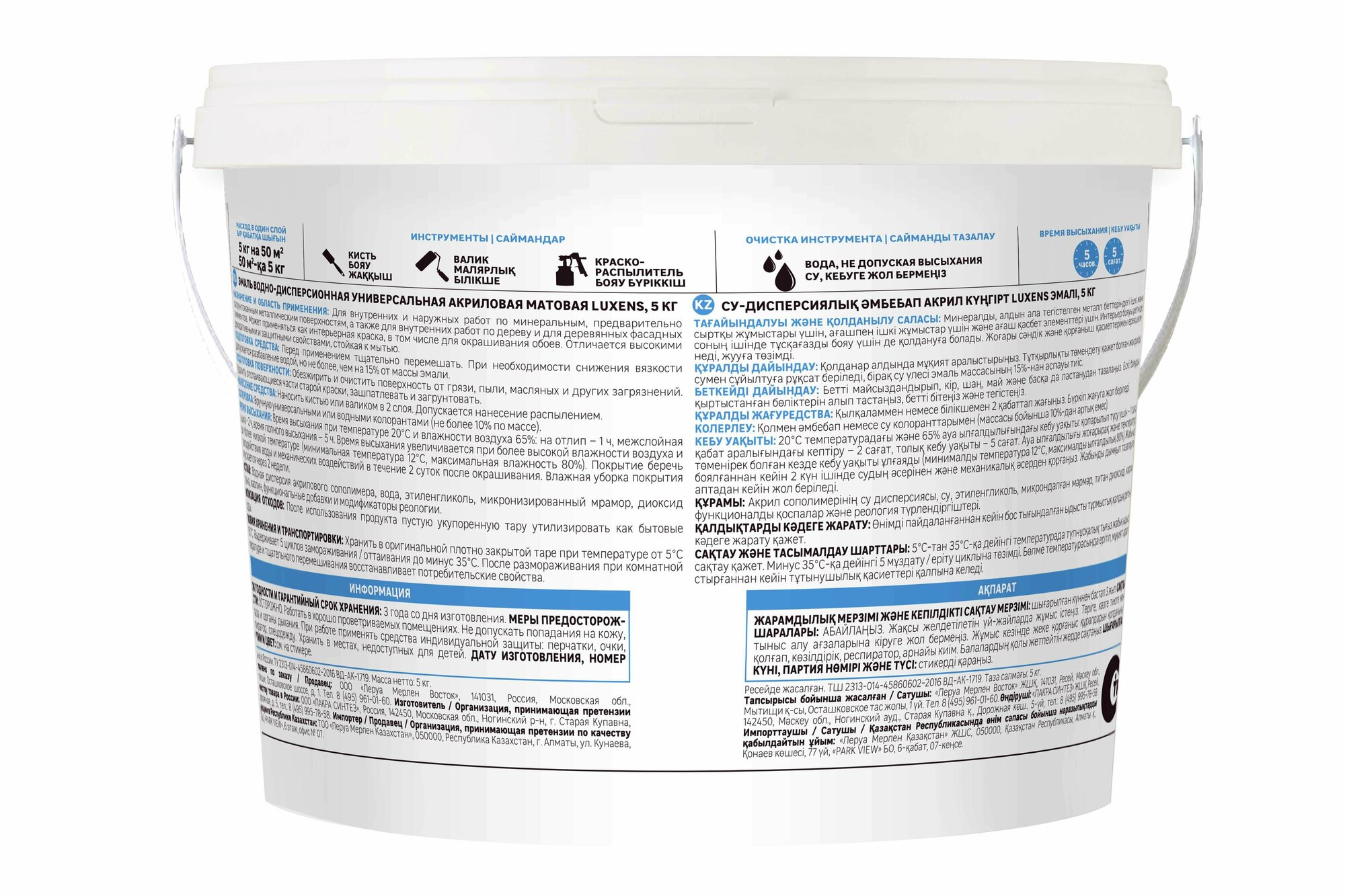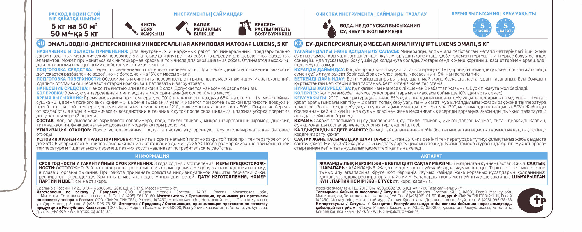**Время высыхания** при температуре 20˚С и влажности воздуха 65%: на отлип – 1 ч, межслойная сушка – 2 ч, время полного высыхания – 5 ч. Время высыхания увеличивается при более высокой влажности воздуха и при более низкой температуре (минимальная температура 12˚С, максимальная влажность 80%).