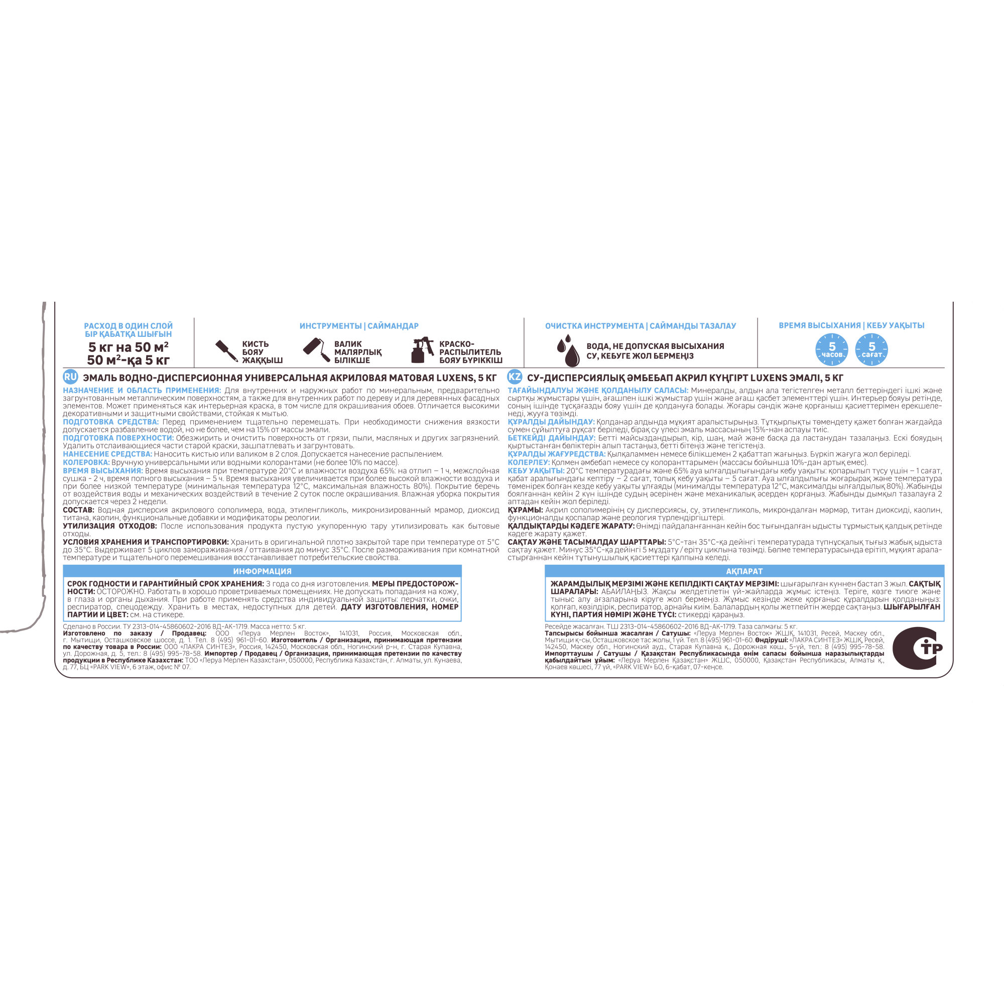 | Время полного высыхания (ч) | 5.0 |