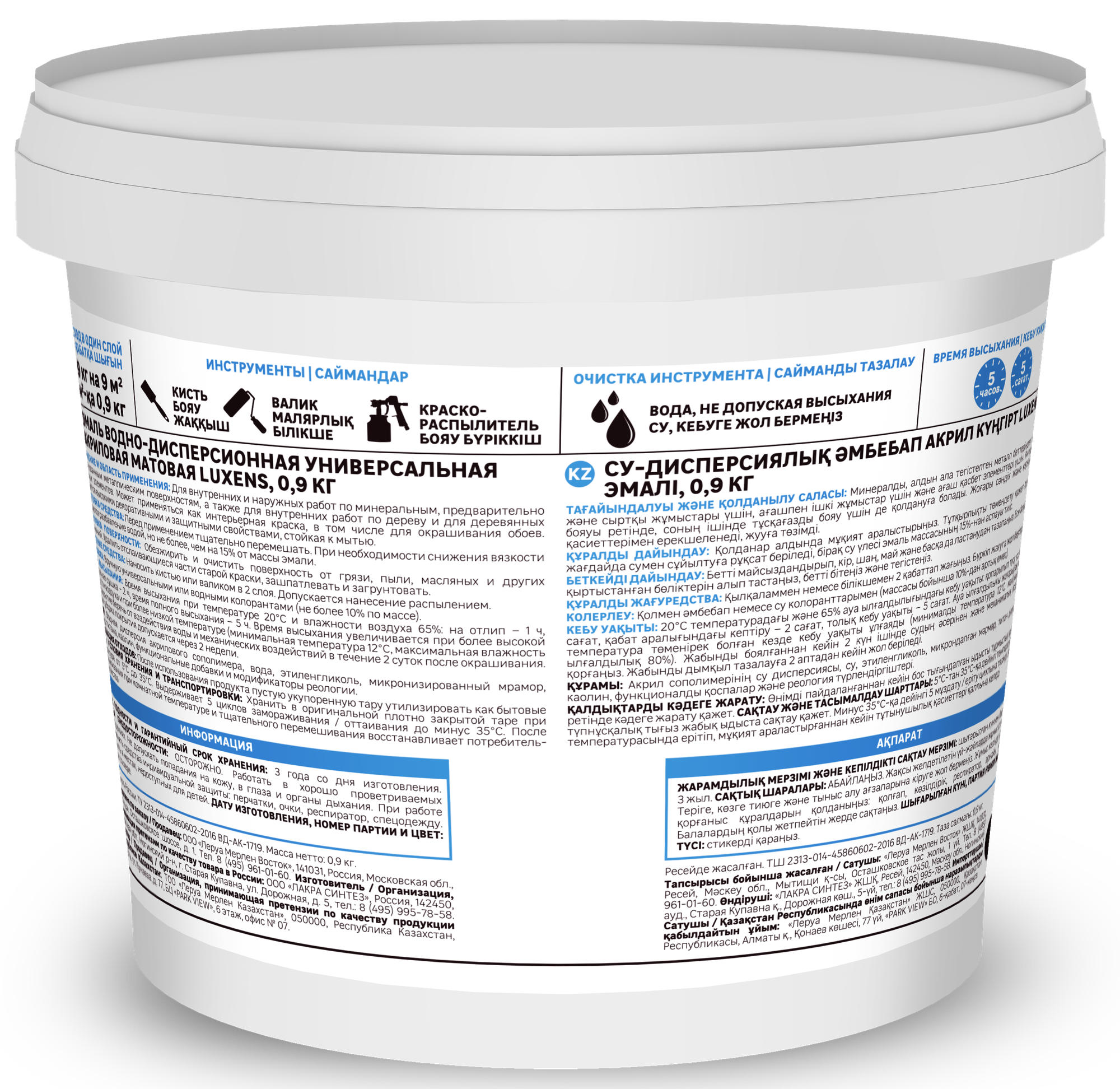**Время высыхания** при температуре 20˚С и влажности воздуха 65%: на отлип – 1 ч, межслойная сушка – 2 ч, время полного высыхания – 5 ч. Время высыхания увеличивается при более высокой влажности воздуха и при более низкой температуре (минимальная температура 12˚С, максимальная влажность 80%).