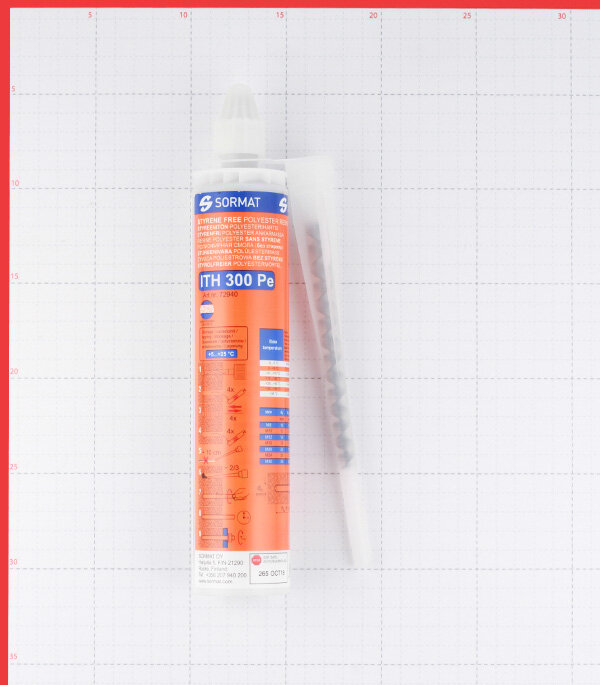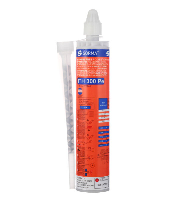 **Комплект для инжекции Sormat ITH 300 PE** используется для монтажа закрепов, ворот, ограждений и т. д. Дает возможность проводить установку максимально близко к краю с минимальными расстояниями между крепежом. Условия использования зависят от разновидности материала шпильки и арматуры.