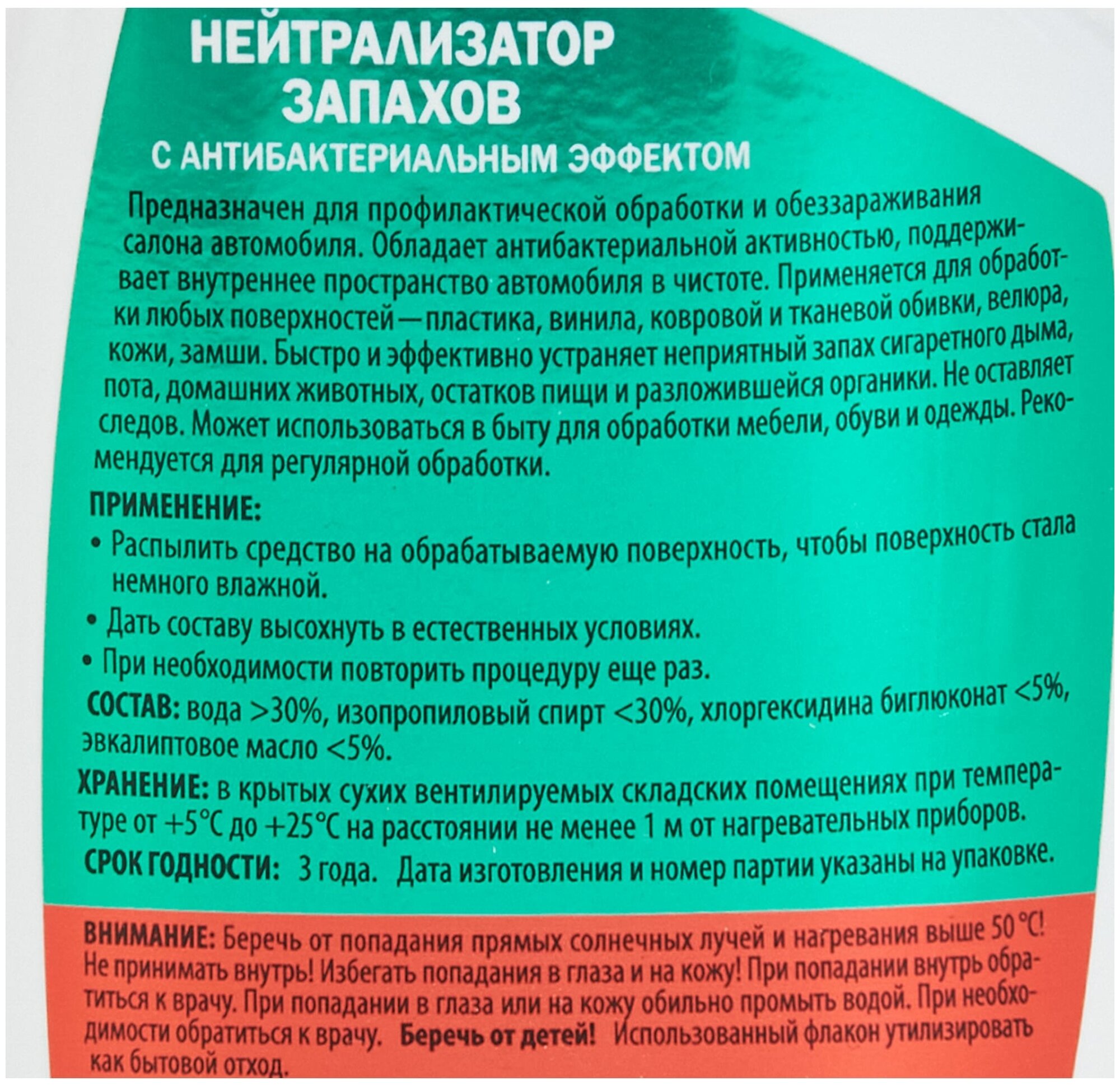 | Состав | вода >30%, изопропиловый спирт <30%, хлоргексидина биглюконат <5%, эвкалиптовое масло <5%. |