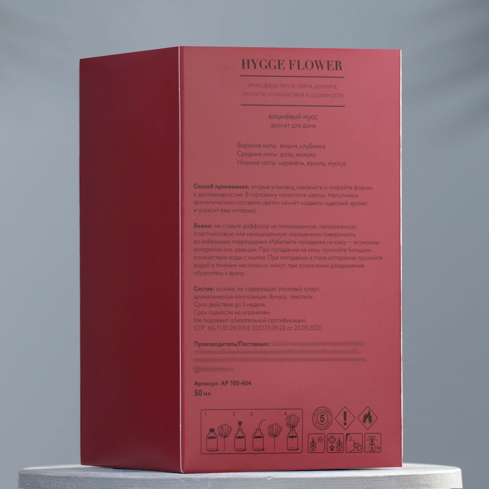 **Ароматизатор воздуха Hygge Flower Вишневый мусс** - быстрый и простой способ наполнить дом или офис легким приятным ароматом. Создает атмосферу спокойствия. Достаточно открыть флакон, наполненный аромажидкостью, и поместить в его горловину цветок. По мере наполнения составом он начнет распространять запахи. Во избежание повреждений не рекомендуется ставить диффузор на следующие поверхности: полированную, лакированную, пластмассовую или незащищенную окрашенную.