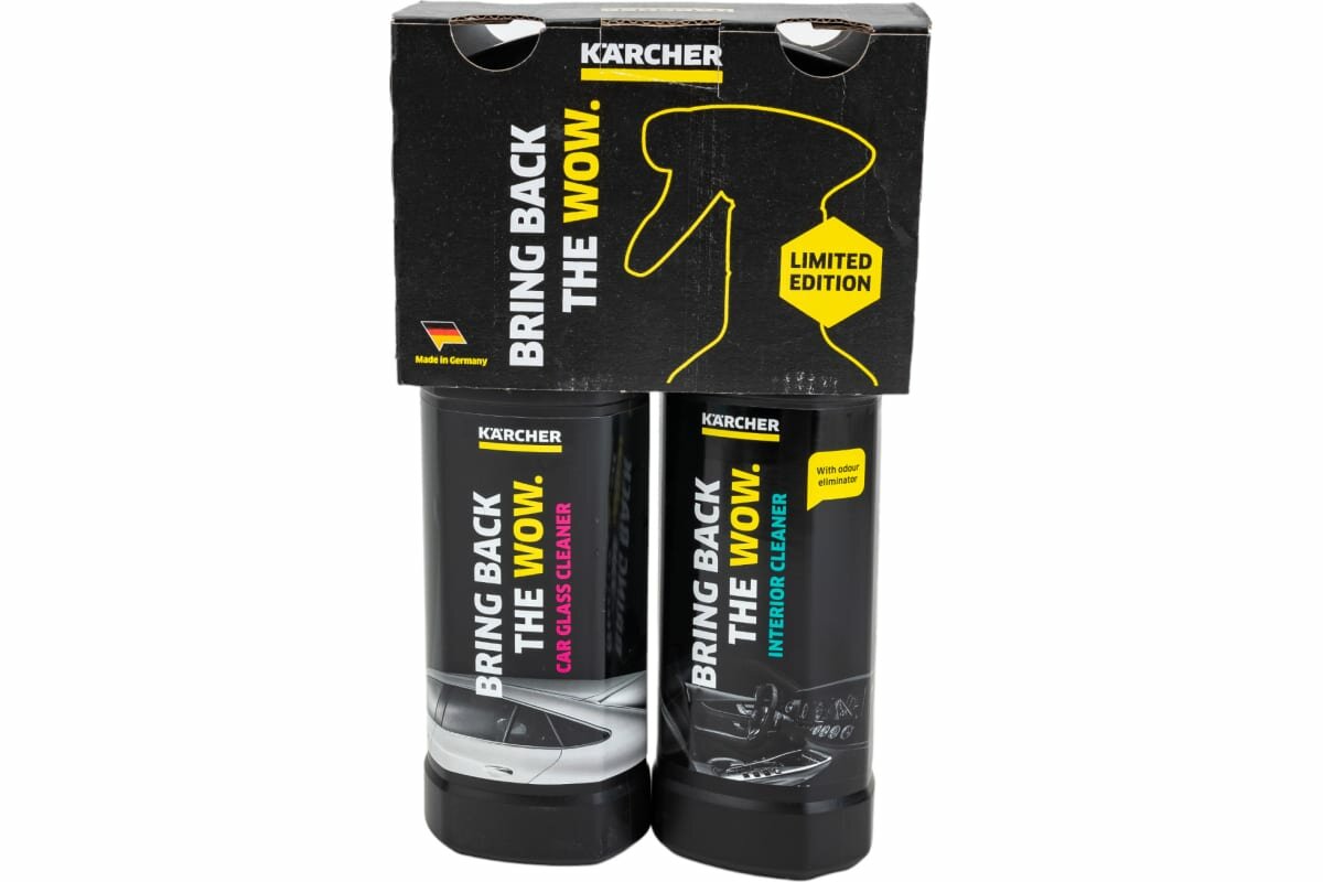 **Средство для очистки стёкол автомобиля и средство для чистки салона автомобиля Karcher, 2х0.5 л** очищает автомобильные стекла и зеркала, не оставляя на них разводов и бликов. Надежно удаляет дорожную грязь, следы насекомых и отпечатки пальцев. С антистатическим эффектом, замедляющим повторное загрязнение. Очищает и освежает все поверхности в салоне автомобиля: от панели приборов и дисплея до резиновых уплотнений и обивки (тканевой или из искусственной кожи). С антистатическим эффектом и эффектом нейтрализации запахов.