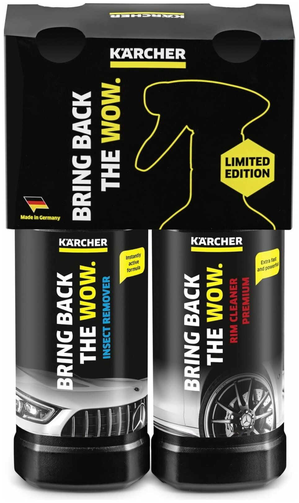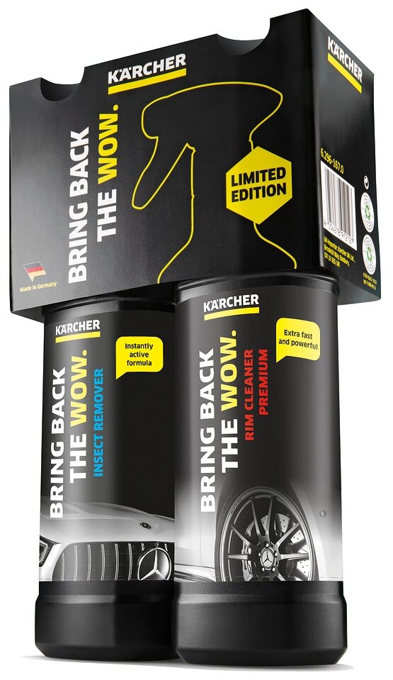 **Средство для удаления следов насекомых и средство для чистки колесных дисков Karcher, 2х0.5 л** бережно удаляет следы с лакового покрытия, решеток радиаторов, зеркал заднего вида, стекол и пластмассовых деталей. Средство для чистки колесных дисков быстро и эффективно очищает любые стальные и легкосплавные диски от продуктов износа тормозных накладок, противогололедных реагентов и прочих дорожных загрязнений. С эффектом изменения цвета, сигнализирующим об истечении необходимого времени воздействия, после которого средство можно смыть.