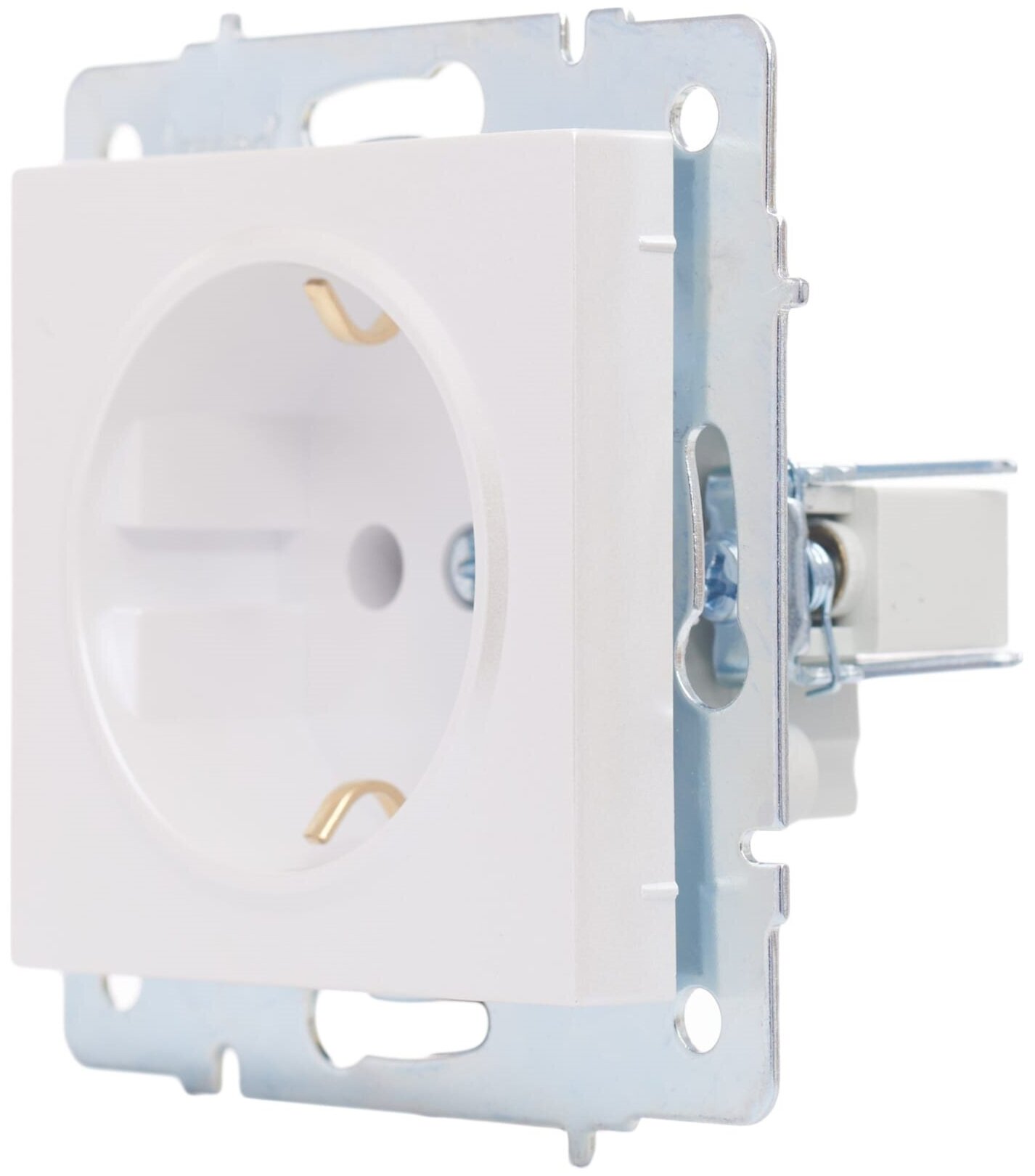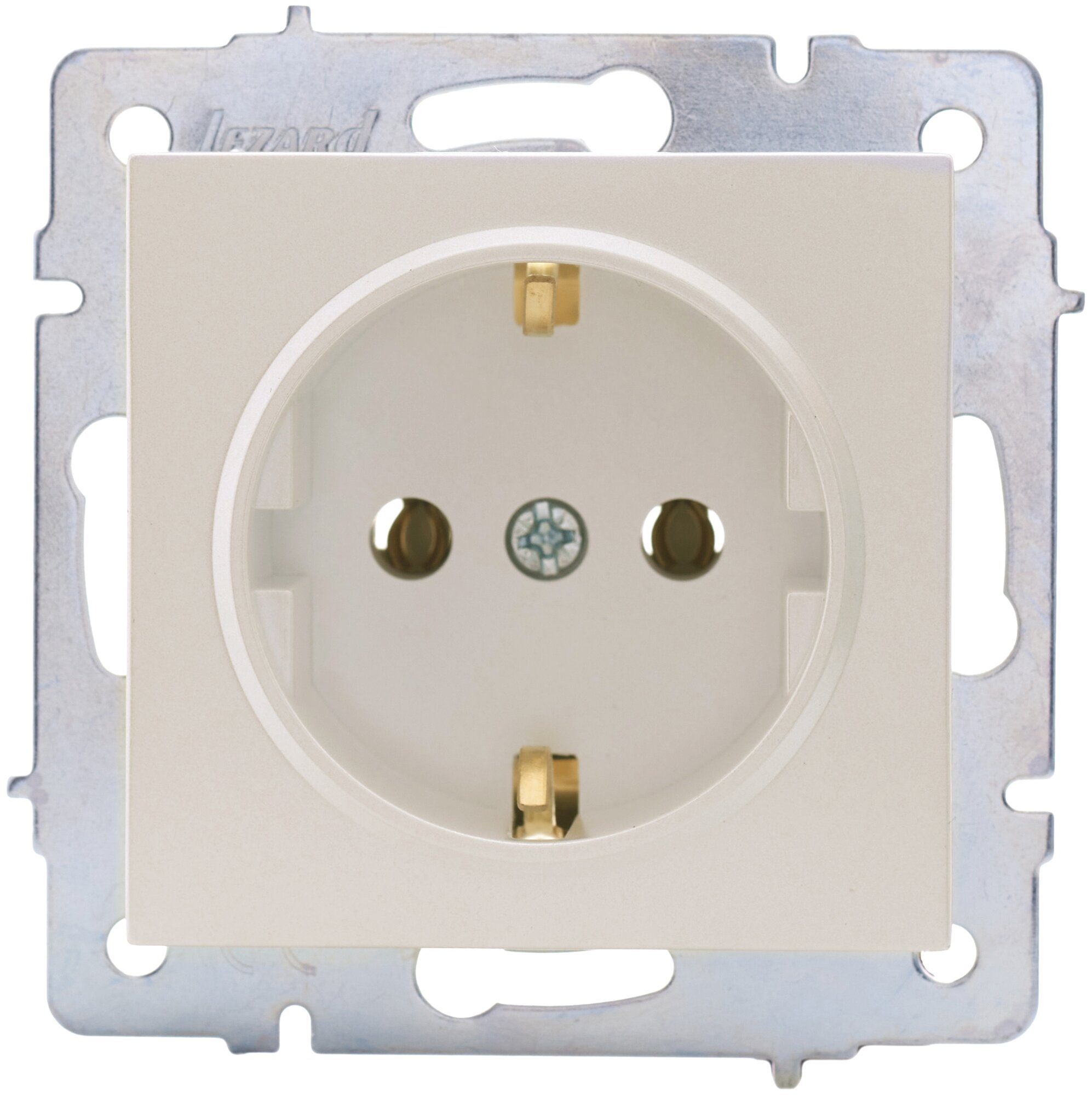 **Розетка Lezard Vesna** изготовлена из синтетического полимера жемчужно-белого перламутрового цвета с высокими показателями эластичности и ударопрочности. Подходит для установки в жилых и нежилых помещениях. Снабжена заземлением, которое защищает человека от поражения электрическим током.